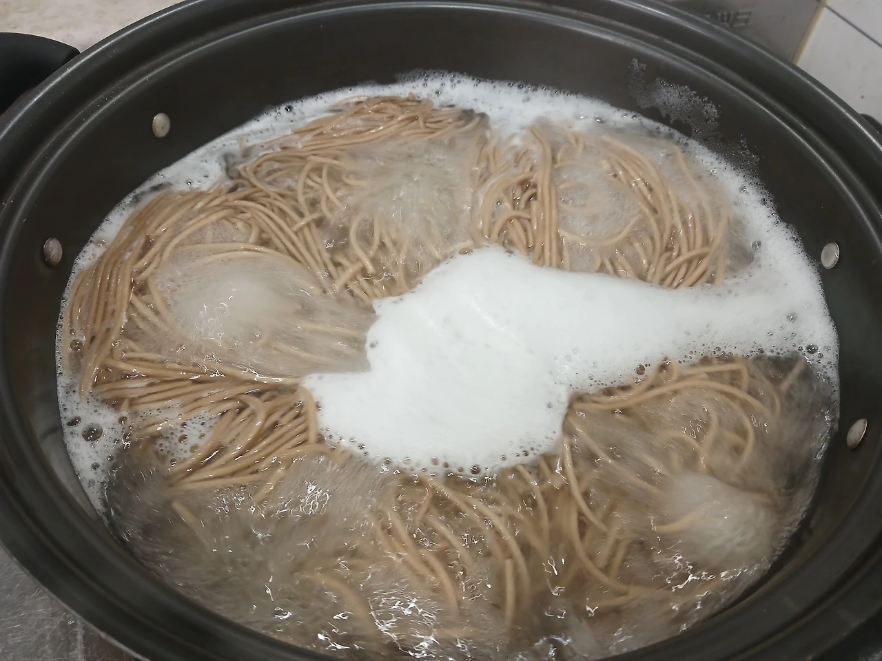 다른화구 끓어오르는 물에 남은 메밀국수를 원을그리며 넣어주고는 7분 타이머가 울리면 건져