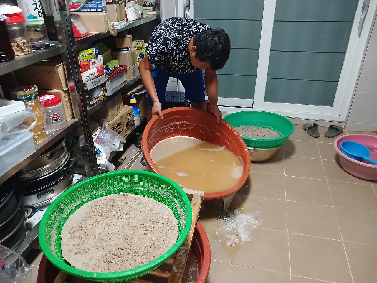 소쿠리에 받쳐둔 갈은 양이 많아 2개로 물에 희석하여 나누어 담가둔다,
