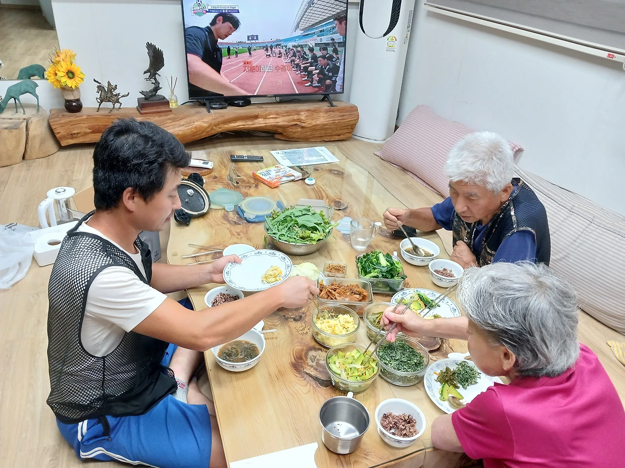 <사진 11>24. 목) 참: 햇 찐 감자, 동치미, 열무김치, 토마토 2가지, 천도복숭아, 얼린 바나나 3개, 얼음복분자주 2명