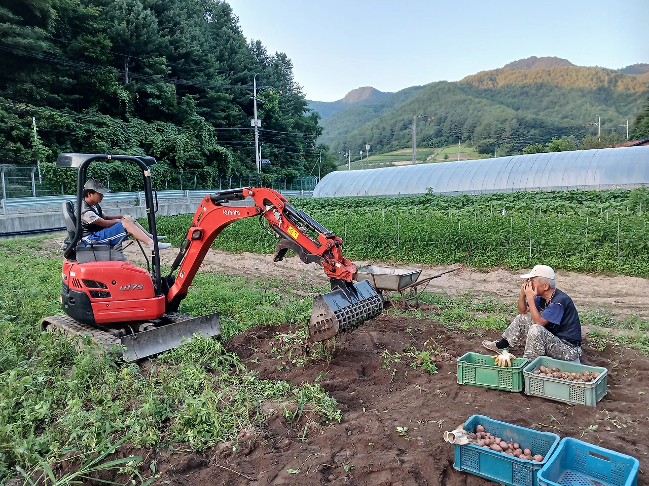 <사진 1>23. 수) 동생과 감자 캐기 (포클래인으로 여러 번 캐서 놔둔 후 쌓이면 같이 담음)