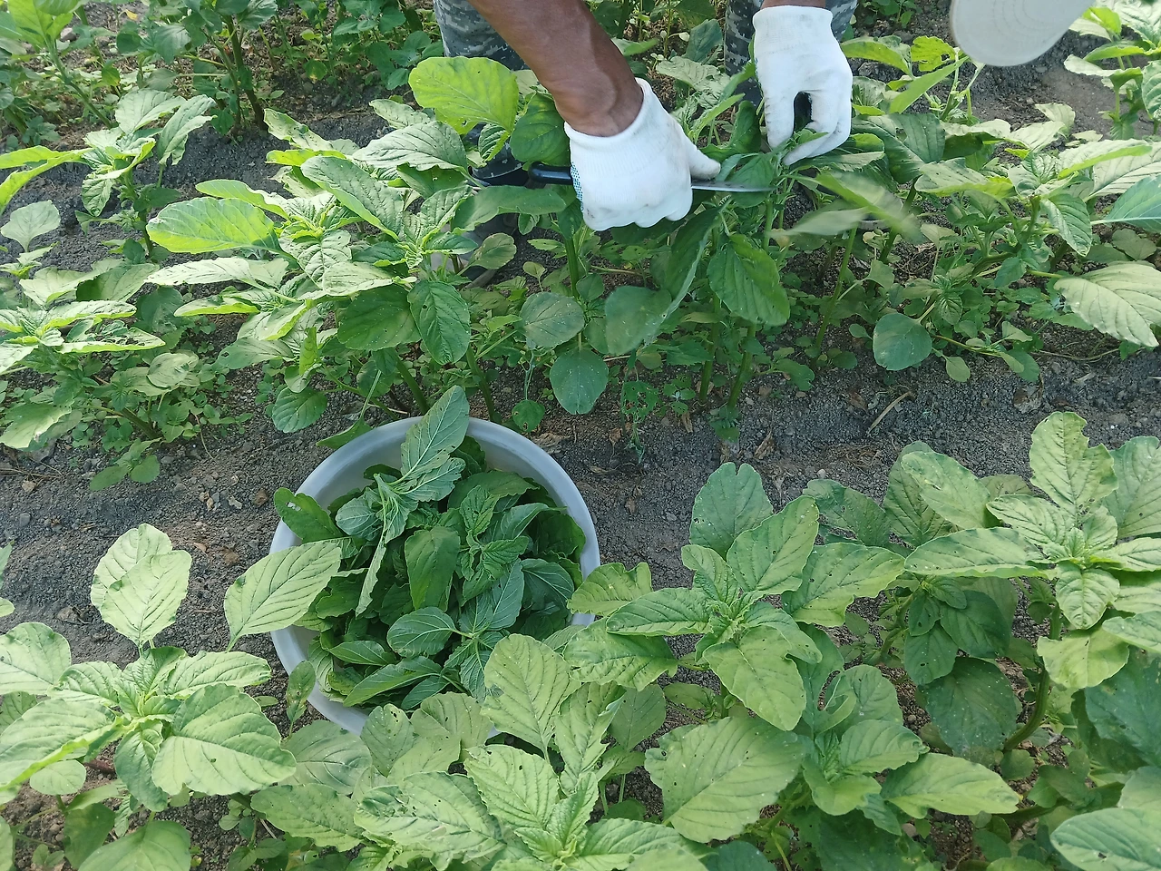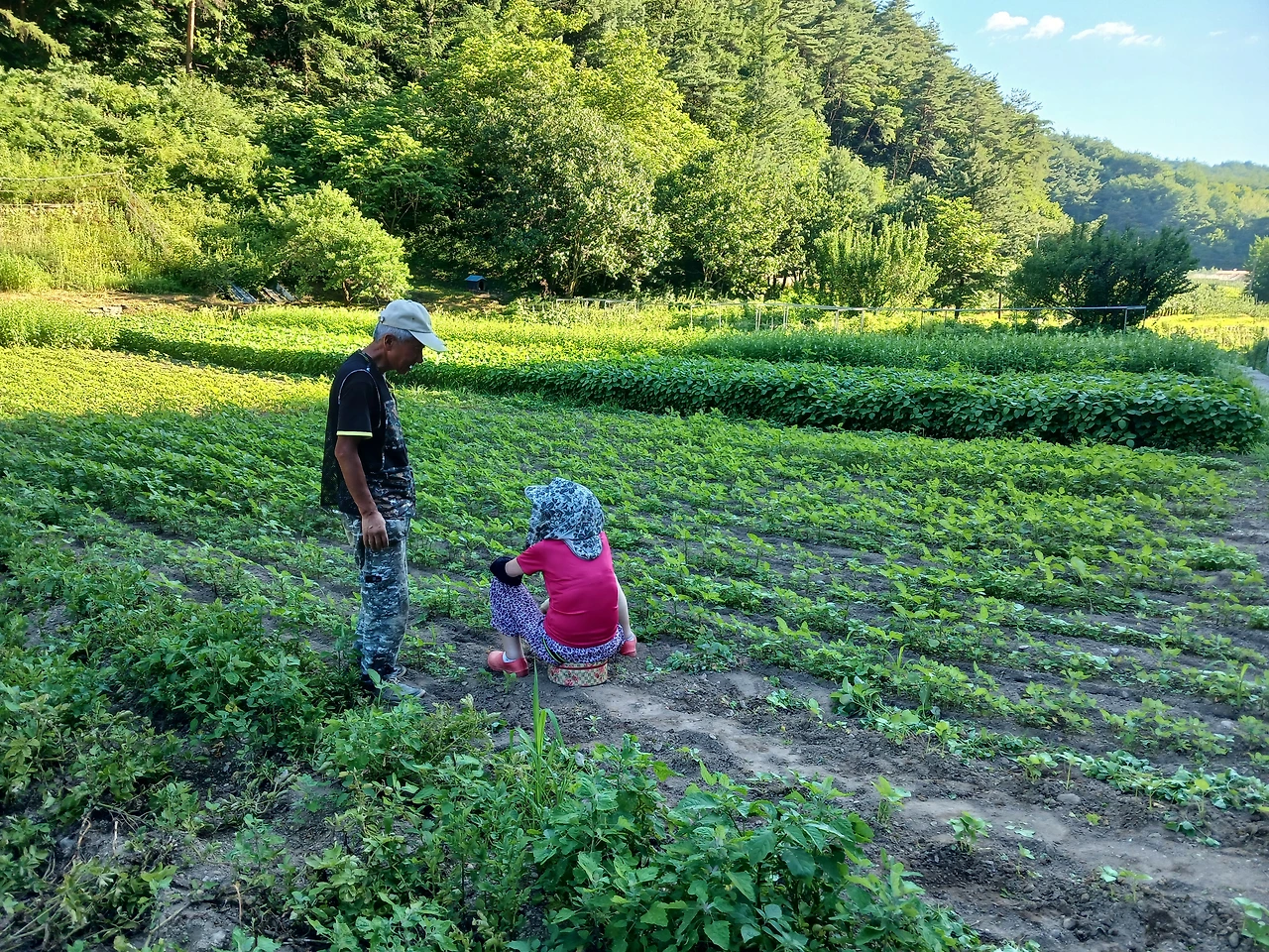 <사진 8> 26. 토) 들깨밭에서 자생으로 난 '비름나물'채취하시는 아버지(풀이 쌈채소와 나물이 되기도/