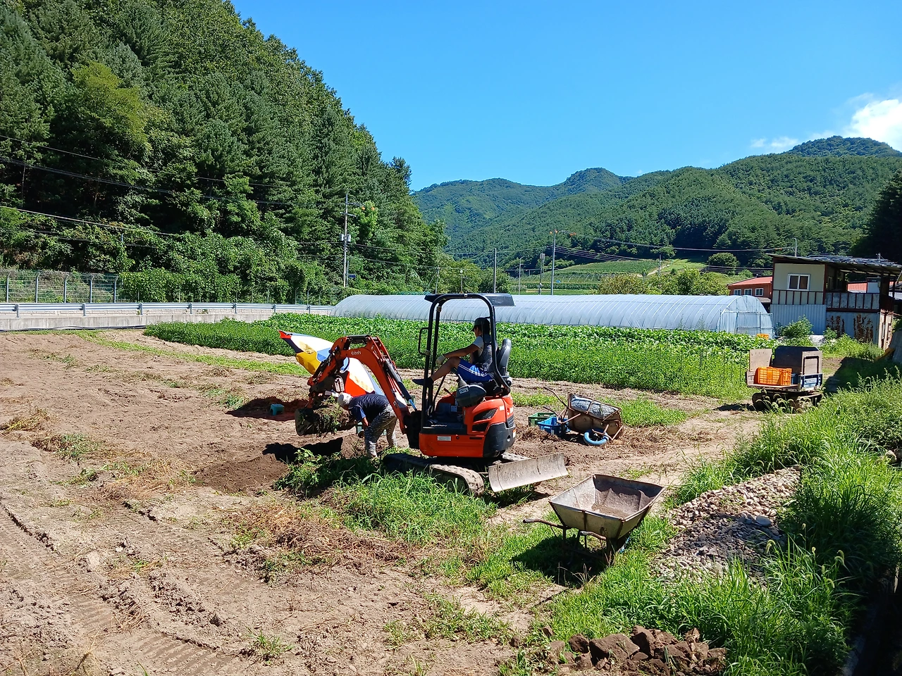 <사진 5> 26. 토) 내가 오전에 하우스 빨래 널었다. 동물들 물갈아 주고 먹이 챙겨 줄 때 먼저 감자 캐고 계심.