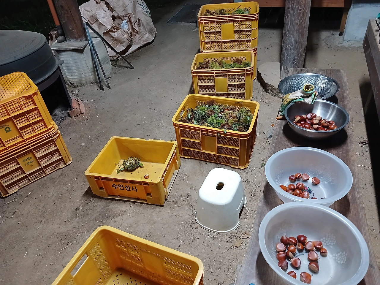 (잘 쳐두면 도둑맞기 십상이다. 우거진 덤불을 불편하게 헤치며 '20kg 노란 컨테이너 6개 밤송이'