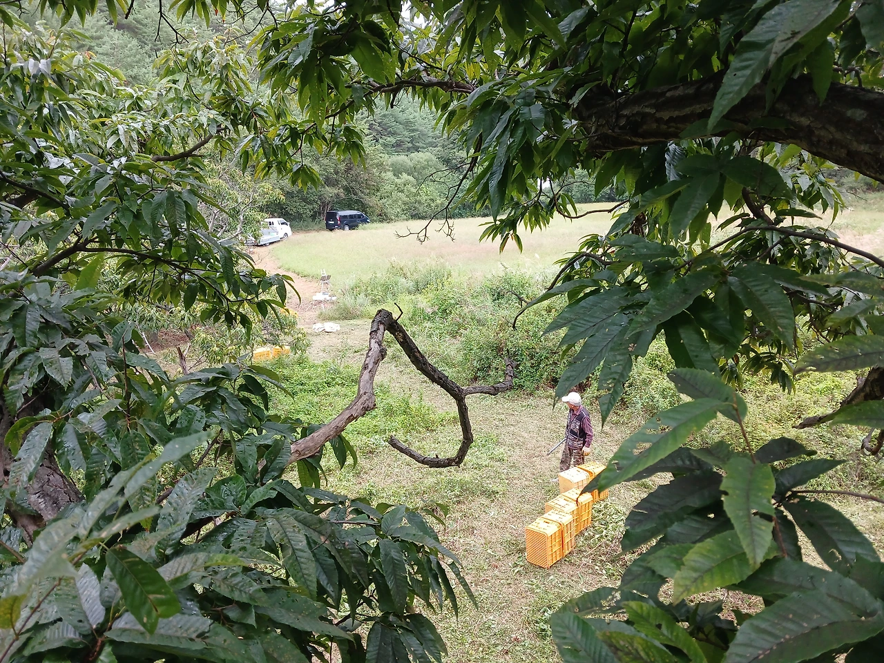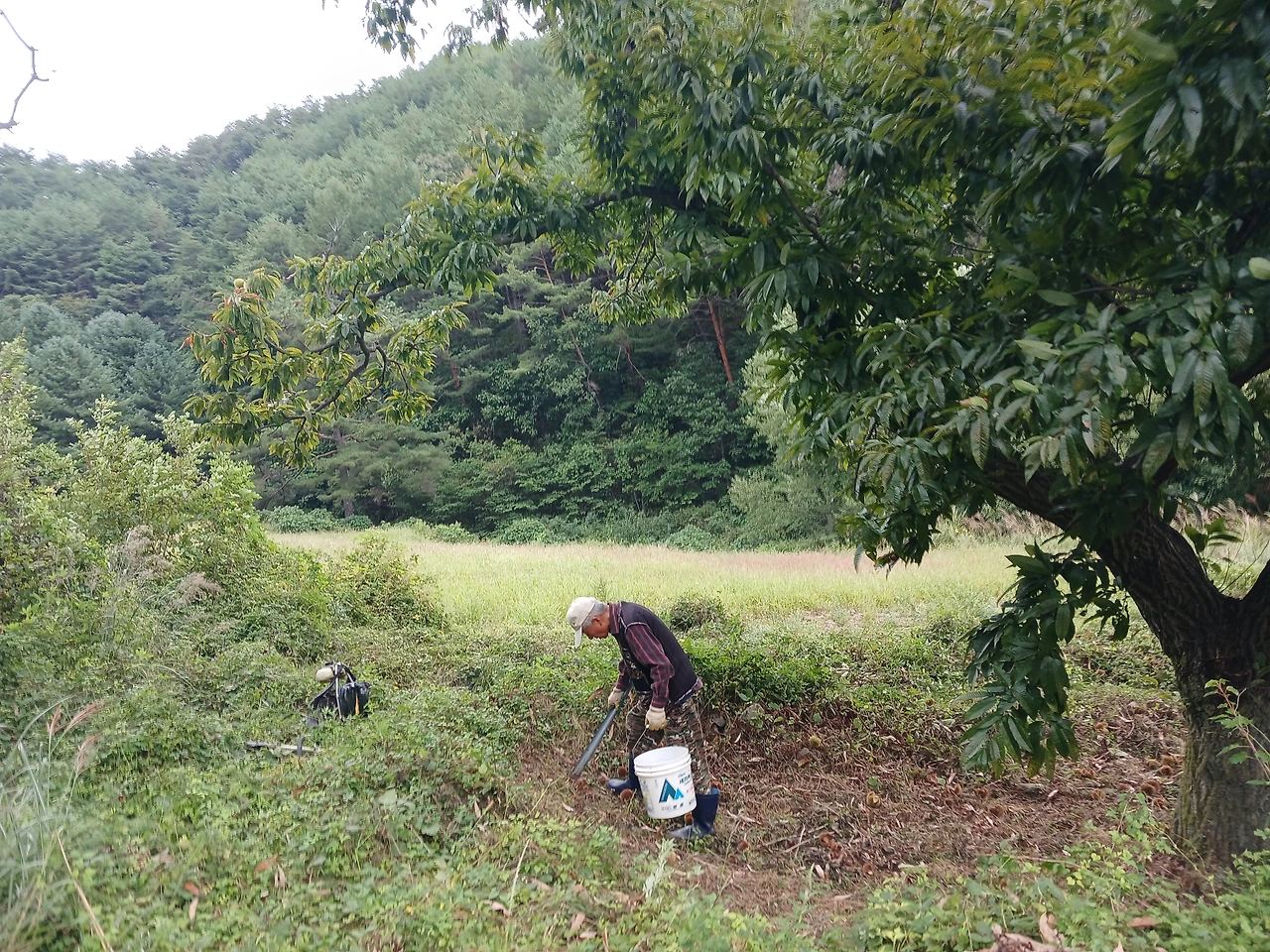 아무래도 비가 올 수도 있다는 예외성 때문에 아버지를 불렀고 행갈이가 심한 밤나무의 수확이 너무 저조하여