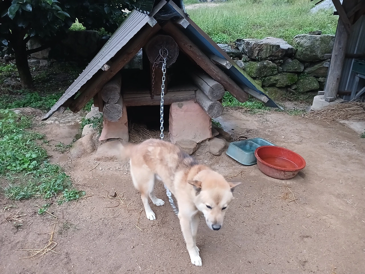 집에 가까이 둔 개산책과 산밭에 묶어두는 목줄에 분리한 목걸이로 해두었었다.
