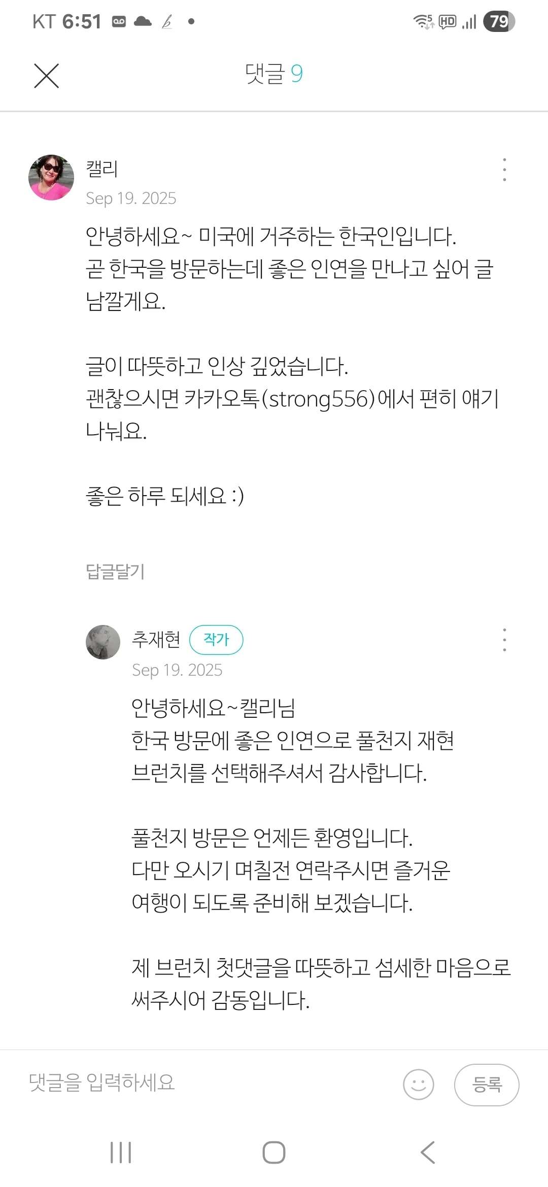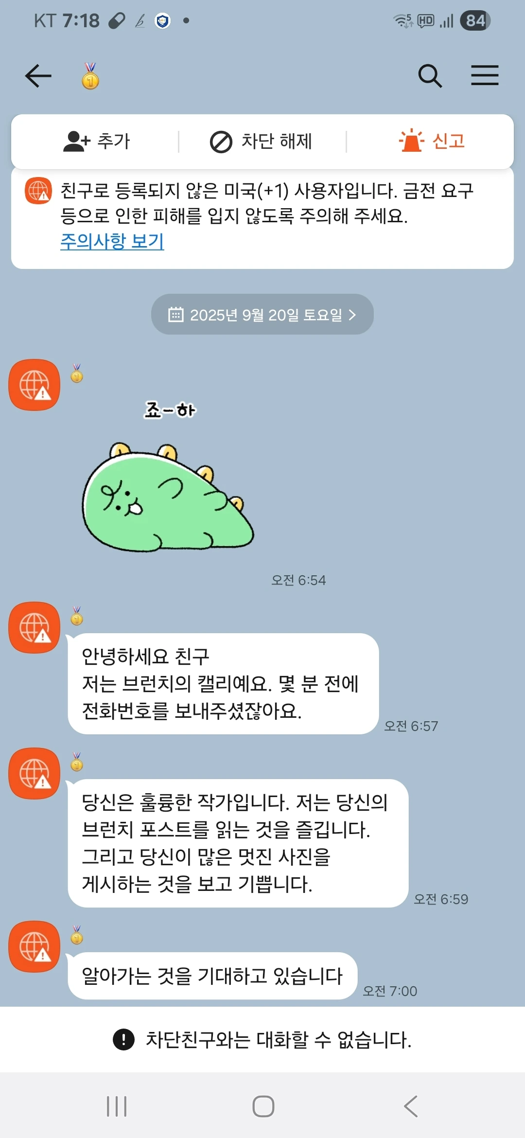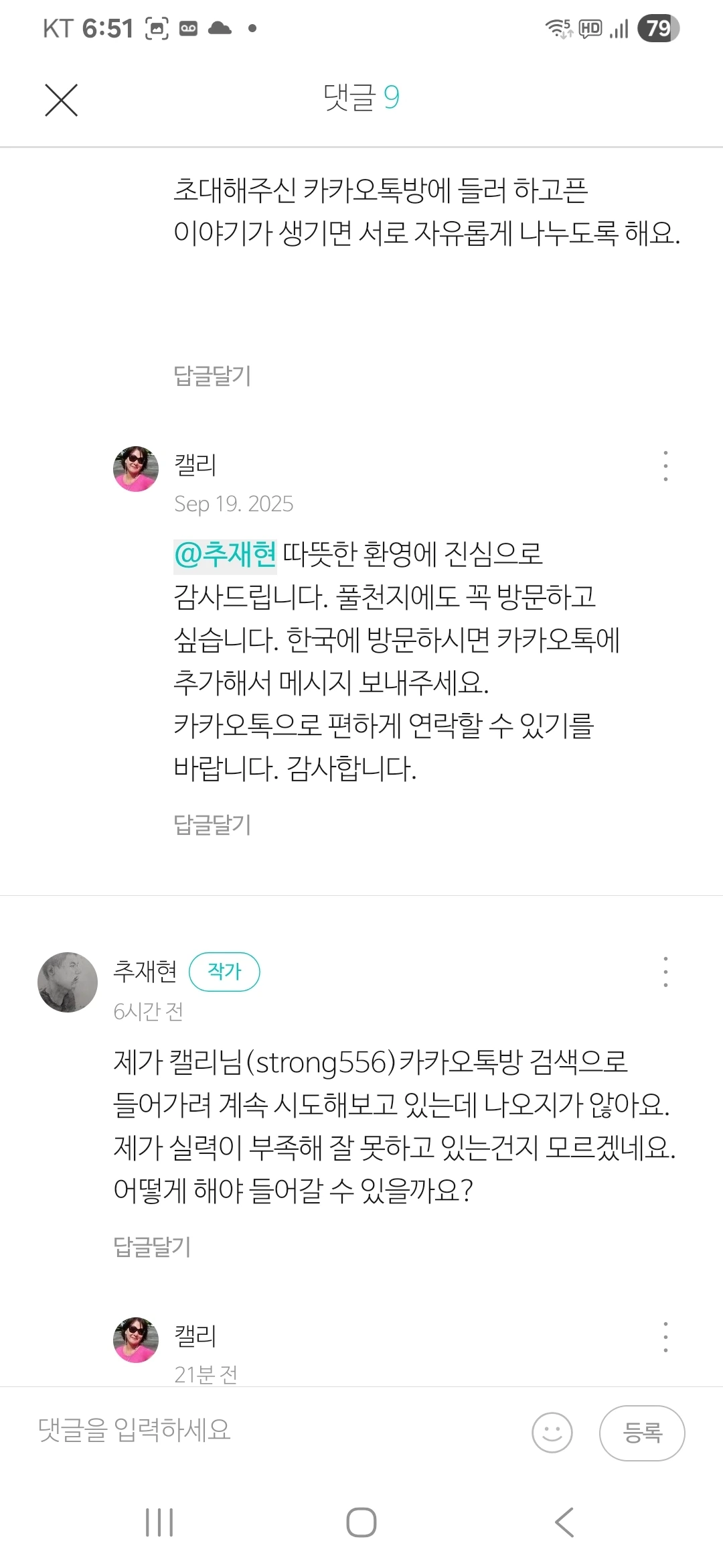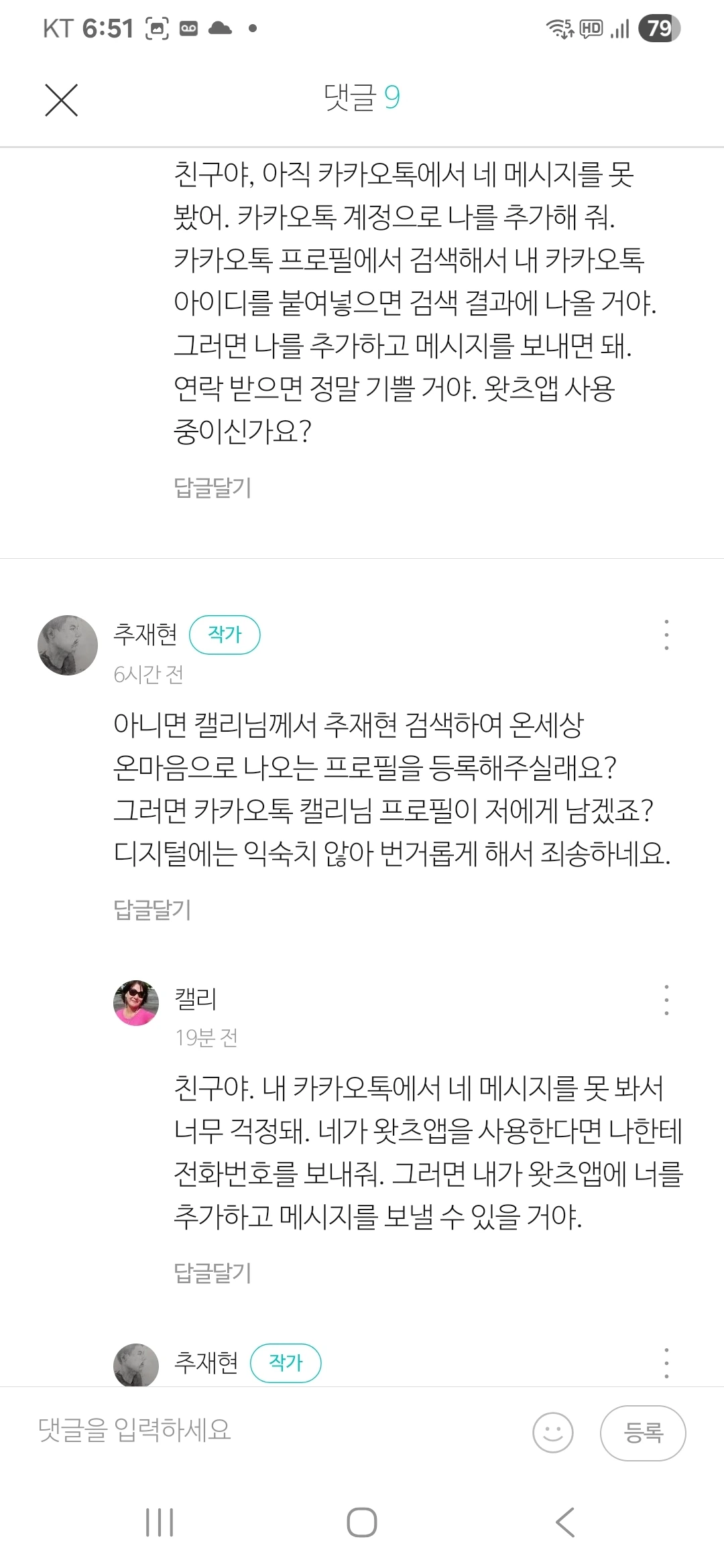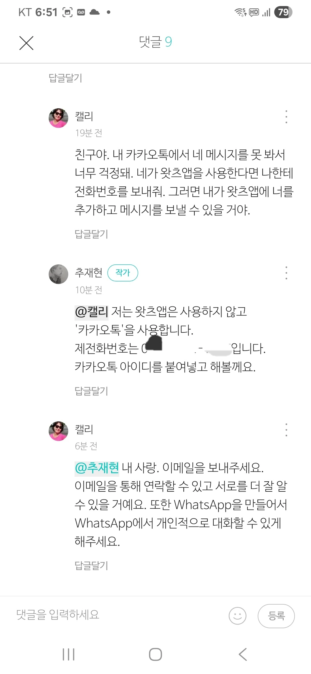 카톡과 브런치 내에 캘리 님을 차단하였다.