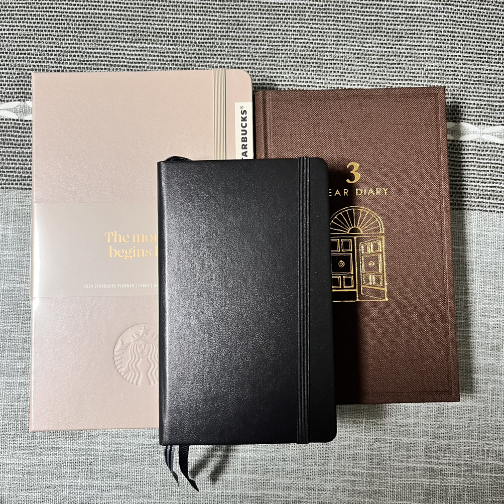 연말을 맞이하여 2024년도 다이어리로 선택한 업무용 다이어리는 먼슬리 1, 위클리 2로 총 3종이며, 집 다이어리는 포켓사이즈, 데일리, 3년 일기로 3종이다. 여기에 더해 멘토 선생님으로부터 추천받은 10년 연기(年記) 한권과 가계부 다이어리까지 있다. 이정도면 너무 욕심쟁이같지만, 다이어리 구입과 작성은 나의 큰 취미생활 중 하나이므로 포기하기 어려운 행복소비라고 주장해보려고 한다. :-) 내년도 다이어리의 제품과 용도를 소개해보면 다음과 같다.
