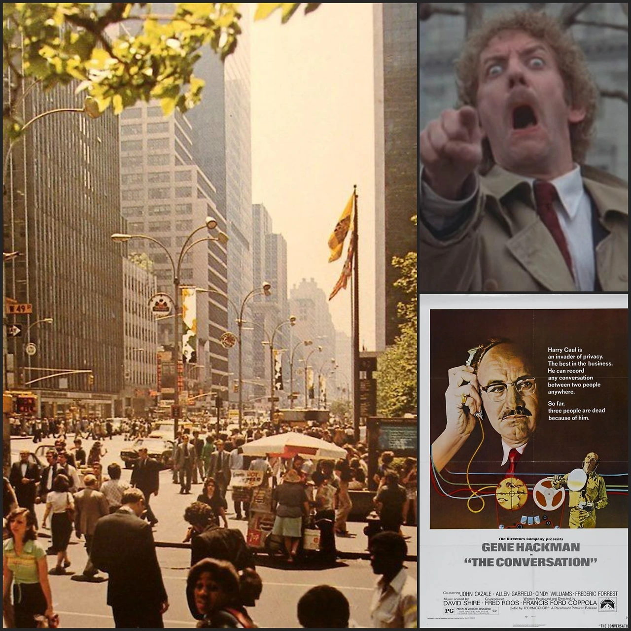 왼쪽 1970년대의 뉴욕 월 스트리트, 오른쪽 상단 필립 카우프만의 '외계의 칩입자'의 유명한 장면,