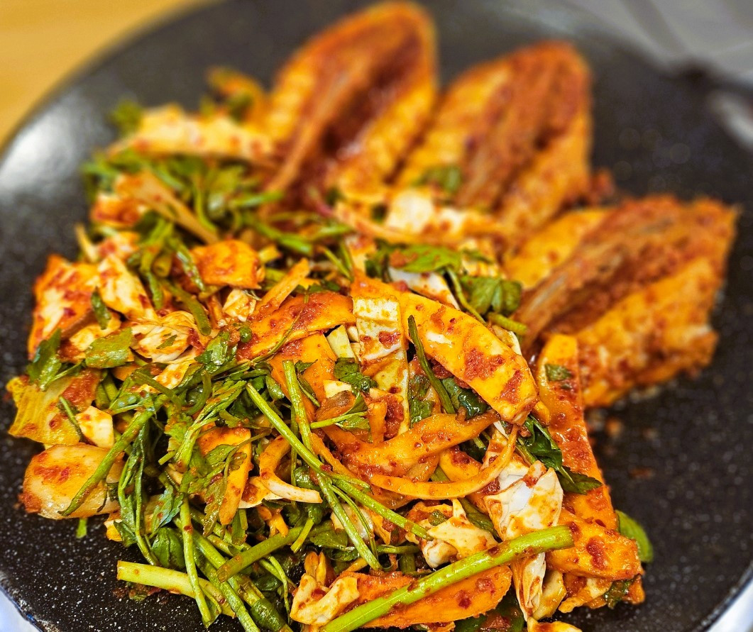 복불고기가 포함된 코스요리가 우리의 저녁 메뉴였다. 샐러드, 열무김치가 먼저 나오고, 복껍질무침이 나왔다. 나는 꼬들꼬들한 복껍질무침을 좋아한다. 꼬들꼬들한 식감에 미나리와 함께 새콤달콤한 양념이 식욕을 자극했다. 가뜩이나 배고픔에 아우성인 위장이 난리가 났다. 지체 없이 다음 음식이 나왔다. 복어회이다. 얇게 썬 복어회에 금가루가 살짝 뿌려져 있다. 복껍질, 데친 복껍질, 미나리, 고추냉이, 레몬, 꽃잎과 함께 나온 복어 사시미는 화려한 자태를 뽐냈다. 레몬을 뿌리고, 복어회 한 점에 미나리, 데친 복껍질에 고추냉이를 살짝 얹어 먹었다. 회를 좋아하지 않는 나도 그 맛에 흠뻑 빠졌다. 미나리 향과 어우러진 쫄깃쫄깃한 복어회 맛이 입에서 살살 녹았다. 우리의 젓가락질은 맛과 비례해 빨라졌고, 화려한 자태의 복어회는 그렇게 순식간에 사라졌다.