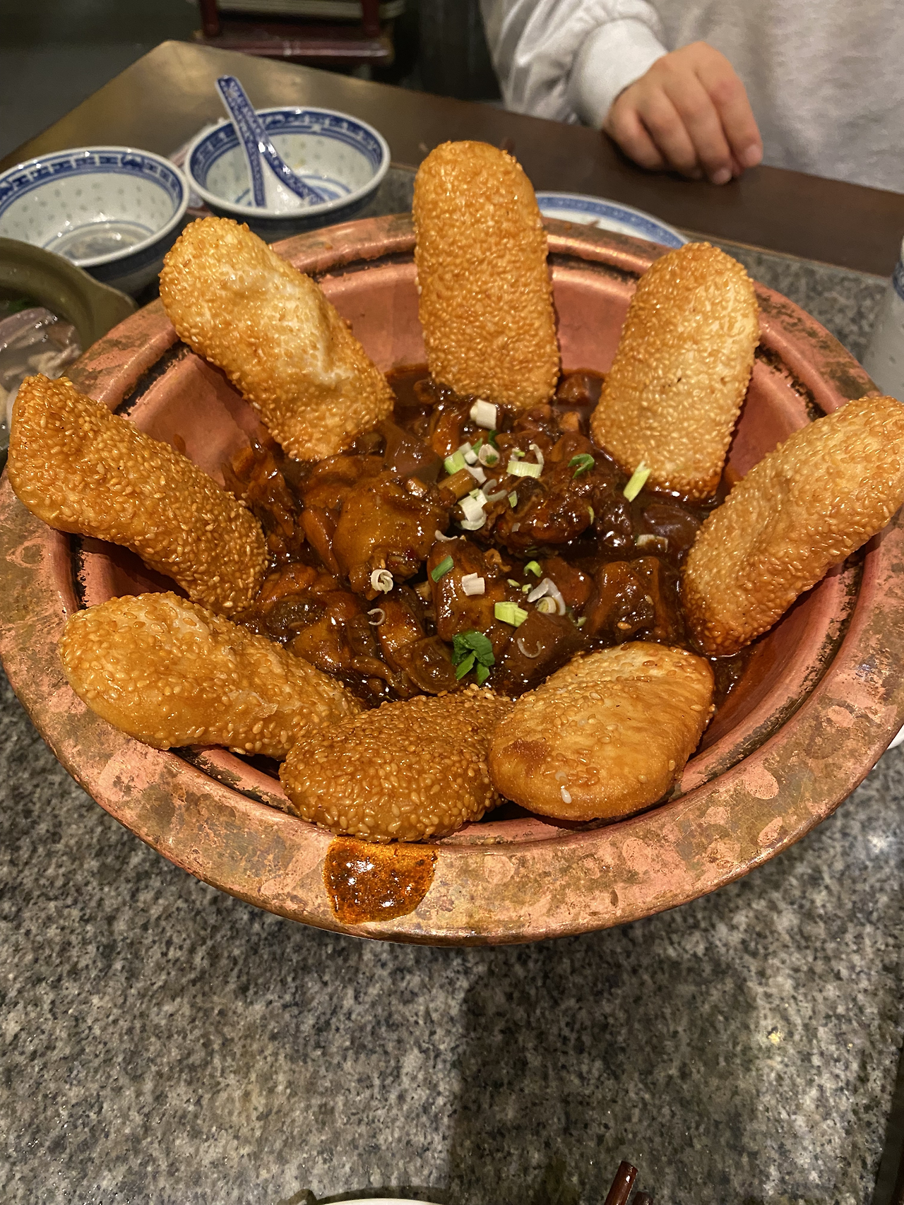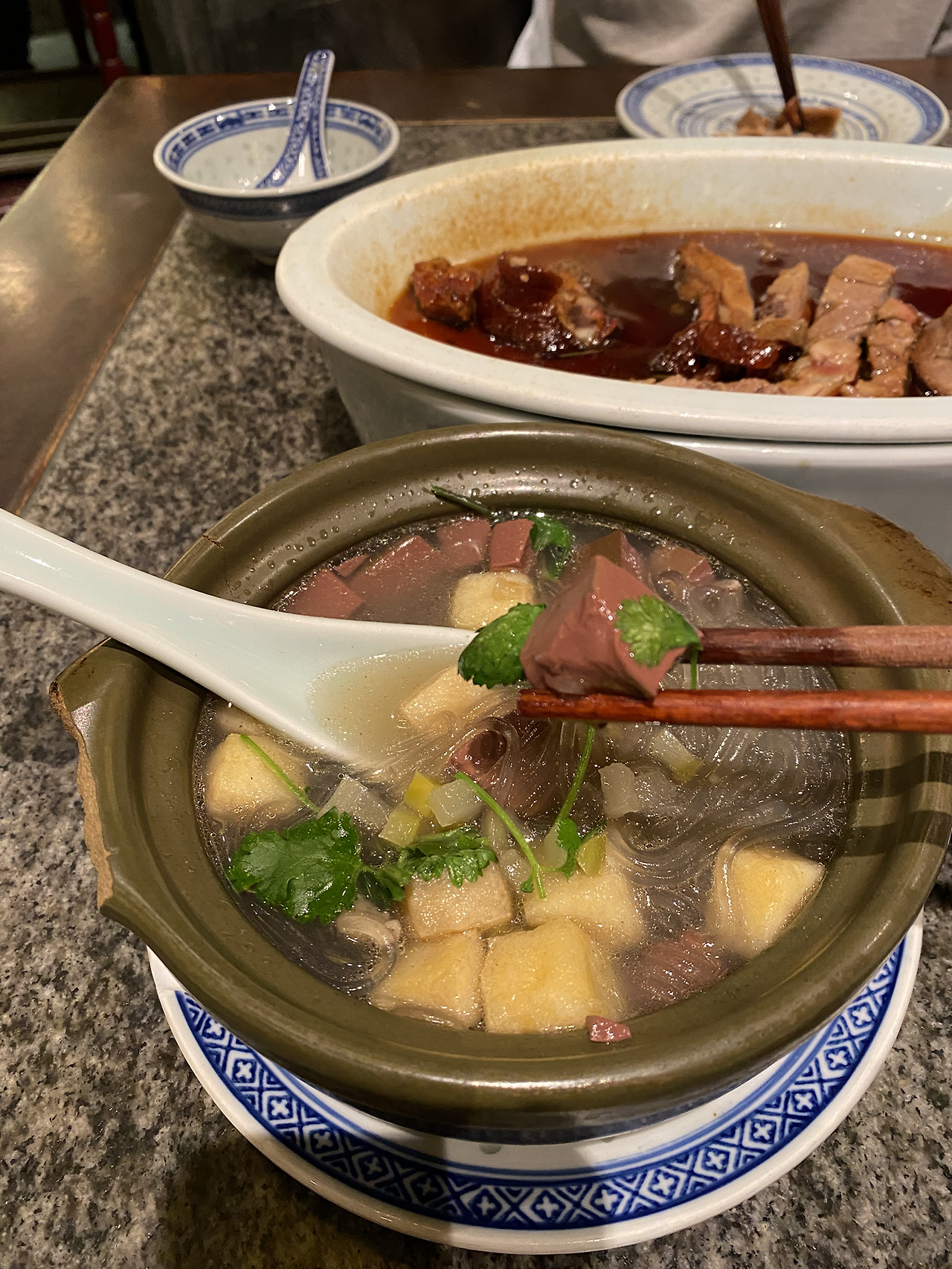 오리구이와 선지를 이용힌 남경전통요리. 찹쌀을 튀긴 빵