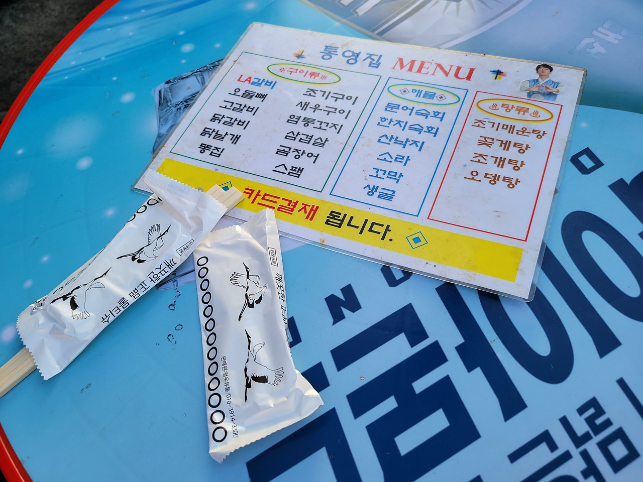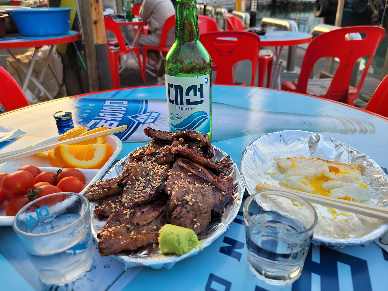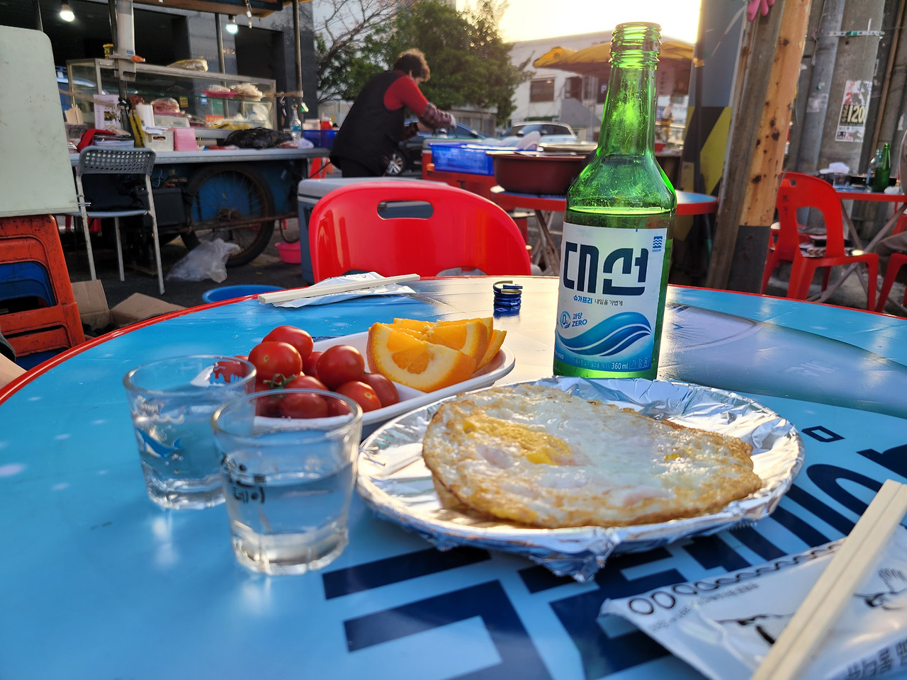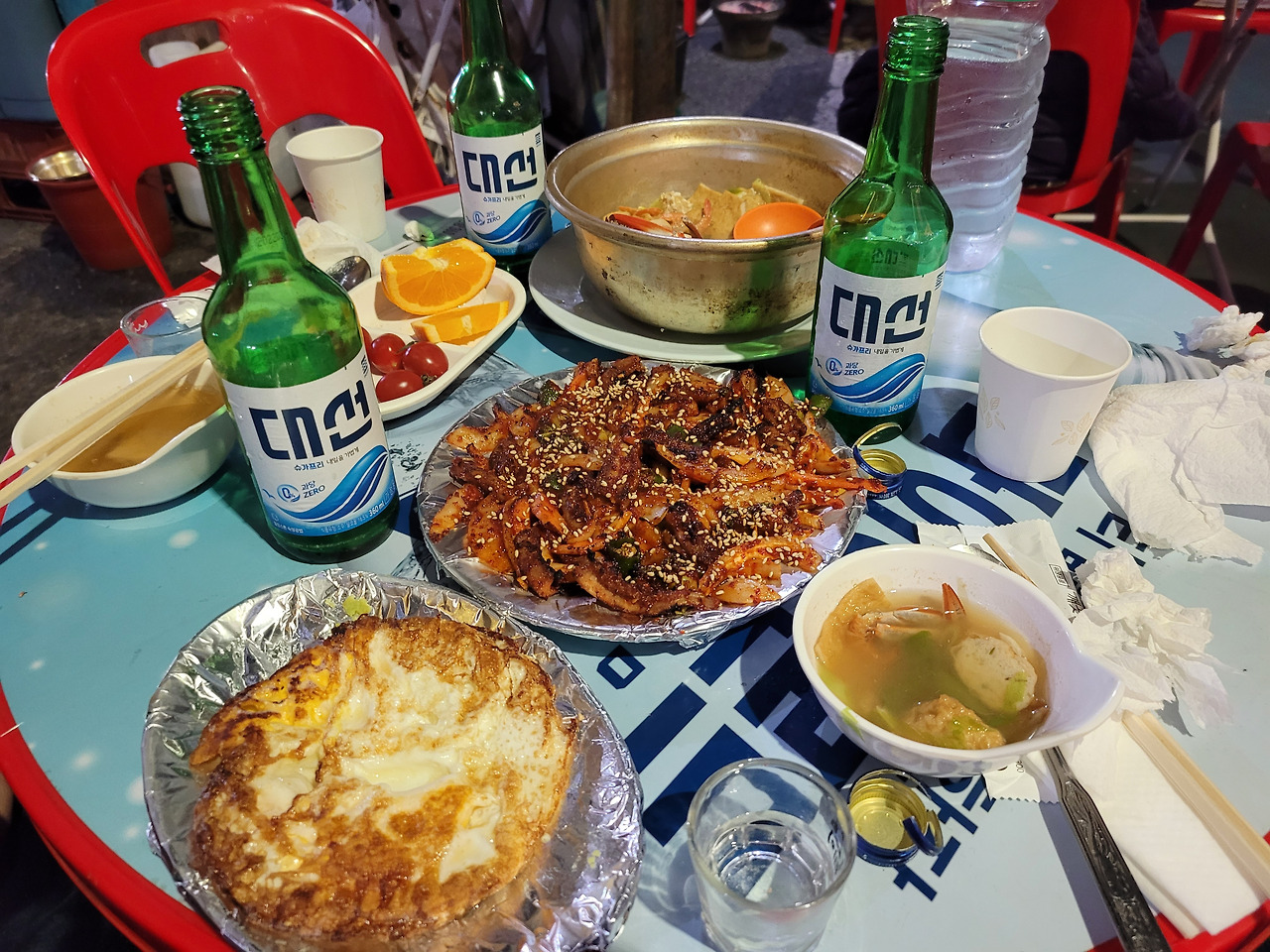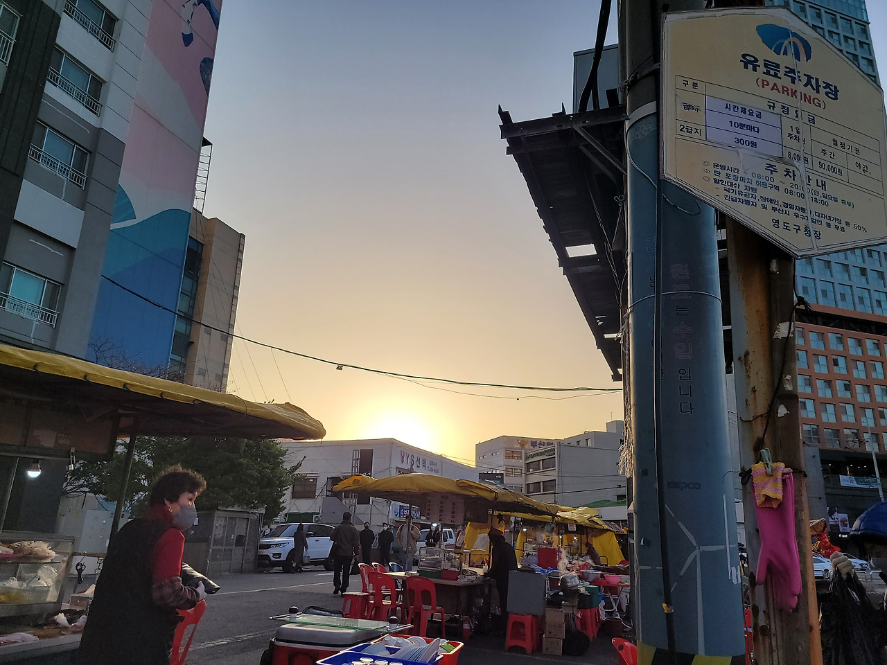 5시를 훌쩍 넘은 시각에 부산역에 도착했다. 택시를 잡아 예약해 둔 호텔로 가서 짐을 풀었다. 우리는 굶주린 배를 채우기 위해 호텔을 나왔다. 간 곳은 호텔 바로 앞인 영도 포장마차 거리였다. 날씨도 따뜻해졌겠다, 여행도 왔겠다, 바닷바람도 들이킬 겸 포장마차에서 저녁을 먹고 싶었다. 밖에서 음식을 먹으면 마스크를 벗고 바깥공기를 쐴 수 있어 더욱 포장마차를 원했다. (실은 여기에 가려고 근처 호텔을 잡은 것이다) 낮에는 주차장으로 운영하고 저녁엔 포장마차로 변신하는 멋있는 곳이다. 부둣가를 따라 일자로 나열된 포장마차는 나에게 그 어떤 분위기 좋은 레스토랑 저리 가라 했다. 우리는 적당한 곳에 자리를 잡았다.