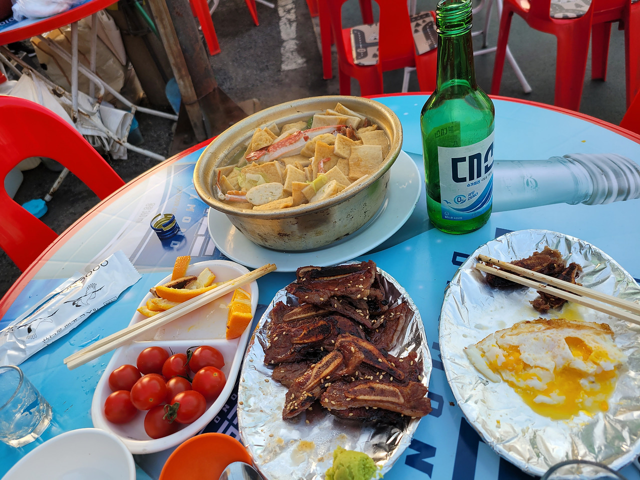 부산 영도 포차 거리는 LA갈비가 유명하다. 가게마다 숯불 화로 통이 하나씩 있는데 거기서 갈비를 구워준다. 노릇노릇 맛있는 간장 양념 냄새와 불향을 가득 입힌 LA갈비의 맛은 일품이었다. 그냥 먹어도 맛있는데 고추냉이를 살짝 올리고 먹는 고기는 또 색다르게 맛있었다. 이제 배도 채웠겠다, 국물 안주를 시킬 타이밍이 왔다. 우리는 어묵탕을 시켰다. 그런데 내가 아는 그 어묵탕이 아니었다. 바다를 머금은 꽃게 집게 발이 어묵을 살짝 잡고 있는 게 아닌가. 전에 어묵집에서 꽃게로 국물을 낸다는 것을 tv에서 본 적이 있다. 크게 한 술 떠먹어보니 꽃게와 어묵의 조합은 예술이었다. 밤이 깊어져 약간 쌀쌀했는데 뜨끈한 국물을 먹으니 다시 술자리가 시작되는 기분이 들었다. 이어서 안주 2개로는 아쉽다며 시킨 꼼장어 구이가 나왔다. (소주도 같이) 꼼장어도 말해 뭐해.. 그동안 먹었던 꼼장어는 불에 구워도 약간 비릿한 향이 조금은 남아 있었는데 이건 전혀 그렇지 않았다. 담백했고, 빨간 양념이 불향을 머금어 꼼장어와 완벽한 조화를 이루었다. 소주 한 병이 네 병으로 늘었다.