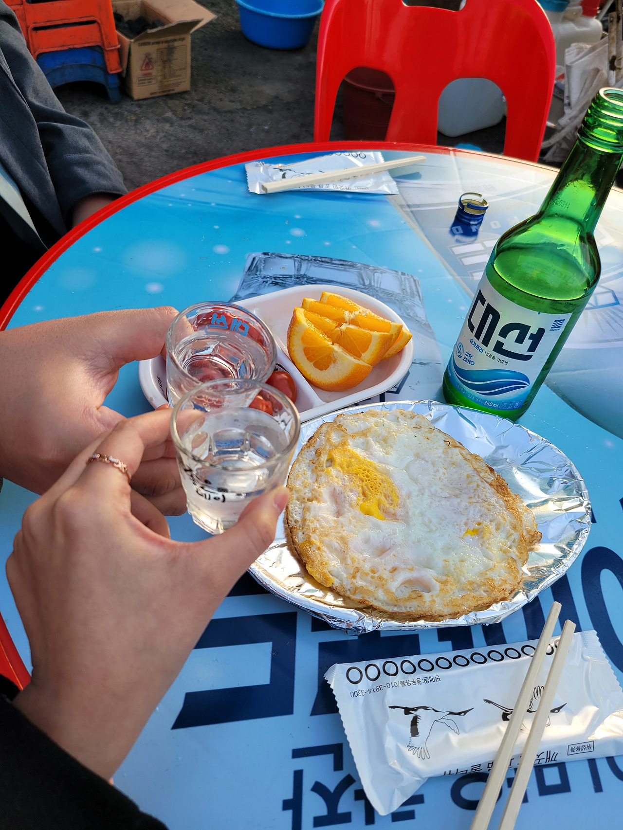 6시가 조금 안 된 시각, 이미 술 병이 꽤 보이는 테이블도 있었다. 우리 부부도 이에 질세라 주문을 서둘렀다. 기본 안주로 방울토마토, 오렌지, 계란 프라이가 나왔다. 계란 프라이에 젓가락을 갖다 대니 기다렸다는 듯이 노른자가 흘러나왔다. 우리는 소주잔을 부딪쳤고 노른자를 가득 묻힌 계란 프라이를 한입 넣었다. 그 순간 남편과 눈이 마주쳤고 감탄사를 연발했다. 무슨 프라이가 이렇게 맛있지? 간도 적당하고, 흰자와 노른자가 부드럽게 어우러져 메인 안주라고 해도 손색이 없었다. 그런 우리를 보고 사장님은 "우리 집 계란 프라이 맛있죠?~ 어떤 손님은 열 번을 리필해요~!" 사투리 섞인 억양으로 환하게 웃으며 말씀하셨다. 자부심이 넘치는 사장님을 보고 나는 확신했다. 계란 프라이를 이렇게 맛있게 하는데 메인 안주는 맛을 안 봐도 이미 합격이었다.