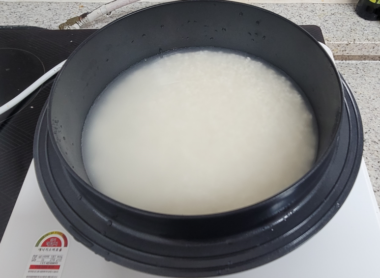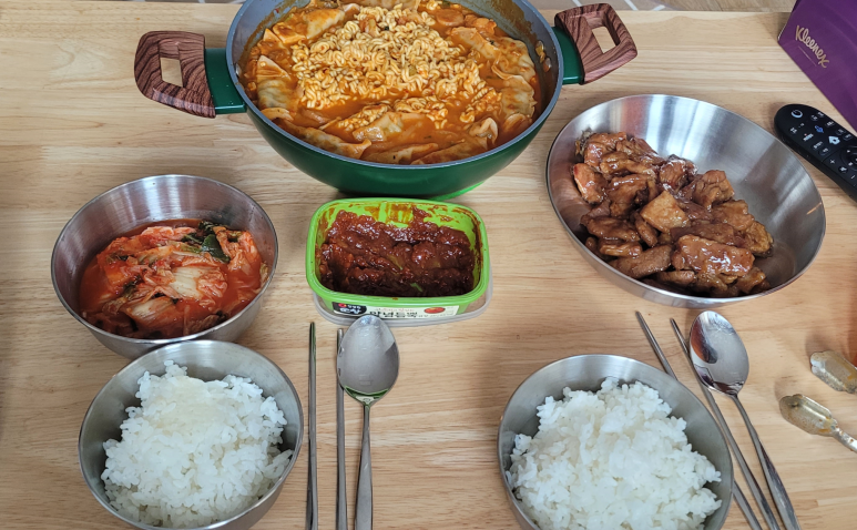 쌀을 씻고 30분 정도 불린 다음, 손 등보다 살짝 아래로 물이 오게끔 물 양을 맞춘 뒤 인덕션에 솥을 올렸다. (심지어 인덕션이 가능한 솥이 있었다) 처음에 센 불로 끓여주다가 하얀 거품이 생기면 중불로 바꿔주었다. 이내 거품이 거의 없어지면 약불로 한 다음 뚜껑을 닫고 10분 정도 더 끓여주었다. 이후 불을 끄고 10분을 뜸을 들이면 되는 것이었다. 뜸 들이기가 끝나 뚜껑을 열어 보니 상상했던 것만큼 밥 김이 올라오는 건 아니었지만 포실한 쌀 알이 맛스럽게 보였다. 혹시라도 탈까 봐 밥이 지어지는 내내 주방을 벗어나지 못하였는데 다행히 주걱으로 저어보니 타지 않았다. 밥 내음도 좋았다. 임무를 마친 나는 흰밥과 어울리는 반찬을 할 수 있도록 남편에게 바통 터치를 하였다. 그는 전날 먹고 남은 김치찌개에 라면사리와 만두를 넣고 다시 끓였다. 동시에 마트에서 사 온 양념 고기를 구웠다.
