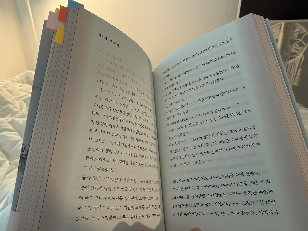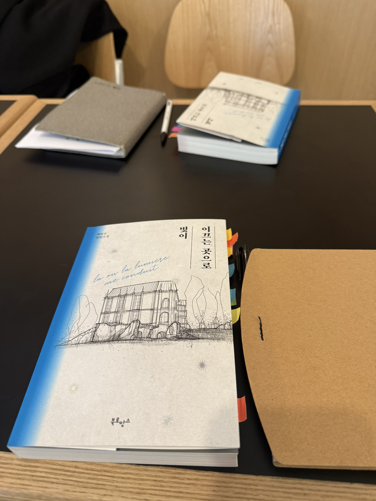 모임원은 작가님 포함 여섯이었다. 커피를 시키고 자기소개를 한 후 본격적으로 독서 모임이 시작됐다. 선정된 책은 백희성 건축가님의 <빛이 이끄는 곳으로>였다. 평소 소설을 잘 읽지 않은 터라 오히려 좋았다. 작가님께서 준비해 오신 발제문에 따라 모임원 한 분 한 분의 생각을 들으면서 '나도 저렇게 생각했는데!'라고 공감하거나 나와 다른 시각일 땐 ‘저렇게도 생각할 수 있구나!'라며 감탄의 감탄을 하였다. 책을 한번 읽고 갔는데 그분들의 이야기를 들으니 깊게 여러 번 읽은 느낌이었다. 그리고 그분들의 말을 되새기면서 한 번 더 읽어봐야겠단 생각도 들었다.