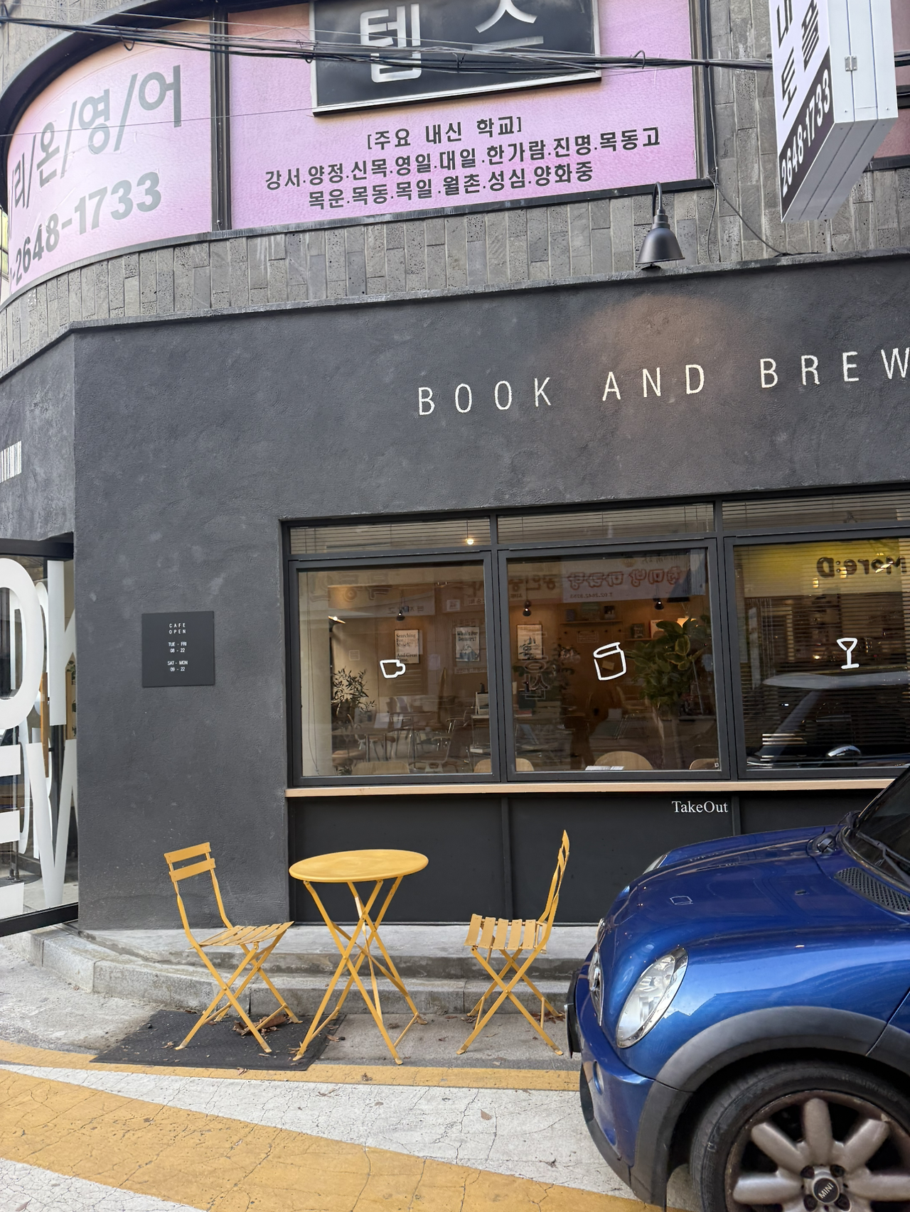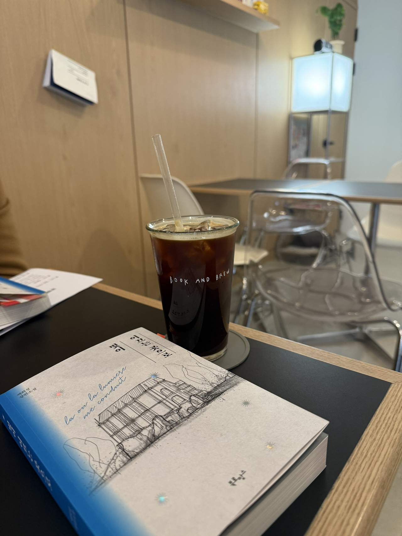 모임 장소는 오목교에 있는 북앤브루라는 북카페에서 진행되었다. 작가님께서 이곳 사장님과 인연으로 독서모임 운영 제안을 받으신 것이었다. 카페는 오목교역과 가까워 찾기 쉬운 위치에 있었다. 혹시나 길을 헤맬까 봐 40분 일찍 도착하였다. 입구에서부터 카페를 찬찬히 둘러보니 외관부터가 책을 읽고 싶게끔 하는 차분한 인테리어였다. 내부는 베이지 톤의 따듯한 느낌이 곳곳에 배치되어 있는 책과 잘 어우러졌다. 홀로 감상을 마칠 때쯤 독서 모임 멤버들이 하나둘씩 모여들었다.