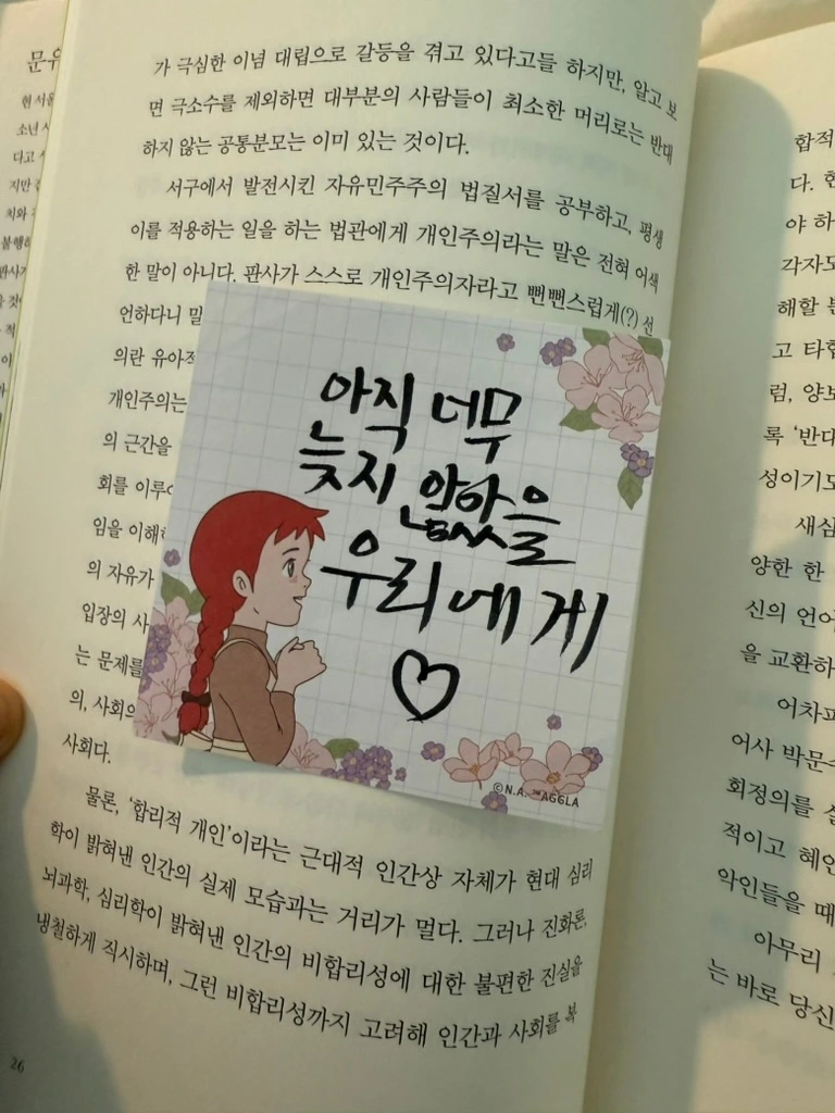 또 다른 페이지엔 ‘아직 너무 늦지 않았을 우리에게’라고 쓰여 있는 메모지가 있었다. 요즘 너무 늦은 게 아닌가라는 새로운 고민을 하고 있었는데(원래 이런 고민을 하는 인간이 아닌데) 머릿속을 꿰뚫어 보는 듯하였다. 읽기도 전에 이 책을 읽었을 전 주인으로부터 강한 메시지를 받아 버렸다. 마침 좋아하는 앤이 그려져 있는 메모지어서 더 그랬는지도 모르지만,