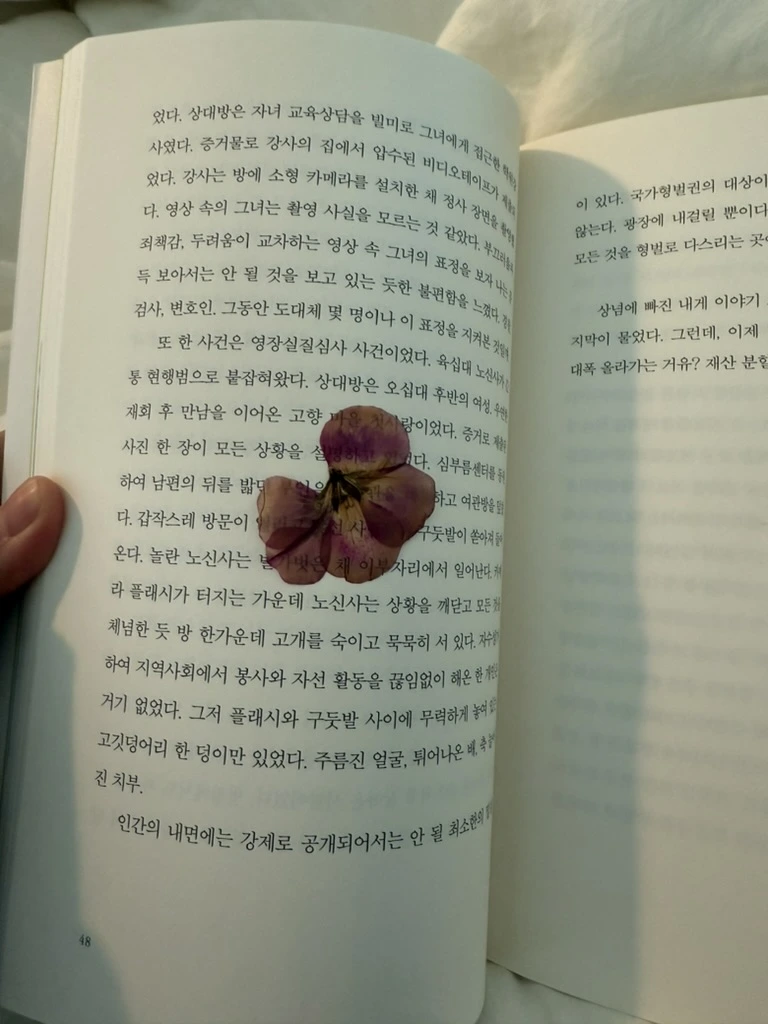오랜만에 찾아온 아침 휴식에 책을 읽어보려고 펼쳤다. 아니나 다를까, 언제 들어갔는지 모를 말린 꽃잎들이 그야말로 '우수수' 떨어졌다. 원래부터 예뻤을 꽃이었겠지만 시간이 지나도 아름다웠다.