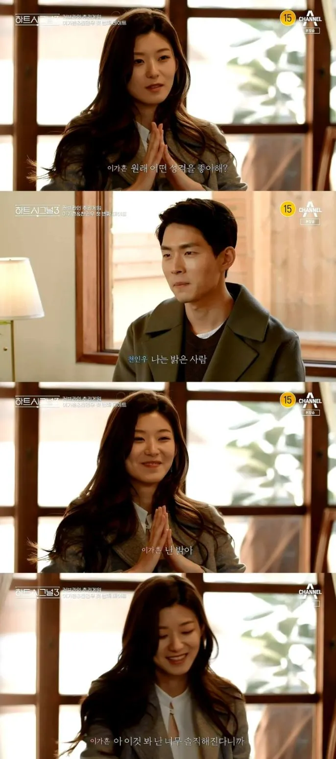 바로 이상형 활용 방법은 소개팅에서 만난 남자에게 호감이 있다면 그 남자의 이상형이 바로 ‘나’인 것처럼 행동하는 겁니다. 글로만 봐서는 잘 모르겠다면 리얼리티 연애 예능 ‘하트시그널 3’에 나온 한 장면을 보여드릴게요.