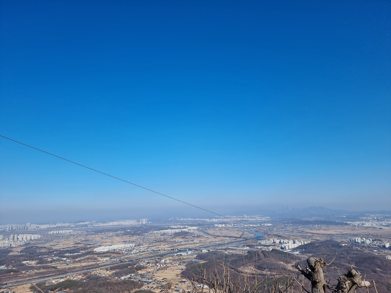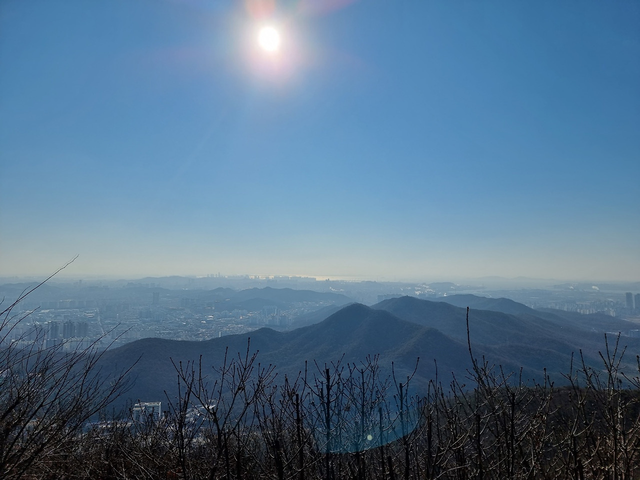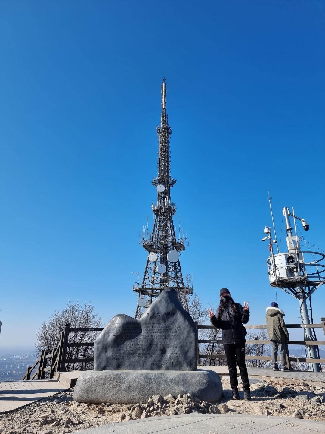 오른 지 얼마 안 돼 정상에 도달했다. 이럴 줄 알았으면 커피는 참을 걸 그랬나 약간은 아쉬웠지만 정상에서 느끼는 상쾌한 기분이 아쉬운 마음을 곧바로 덮어주었다. 오랜만에 타는 산이라 체력적으로 힘들어서 그런지 생각했던 것 이상으로 뿌듯함을 느꼈다. 춥다고 집에만 있을 뻔했는데 산을 타서 더 그렇게 느꼈을 것이다. 정상 기념사진을 찍고 한 곳에 자리를 잡고 앉았다.