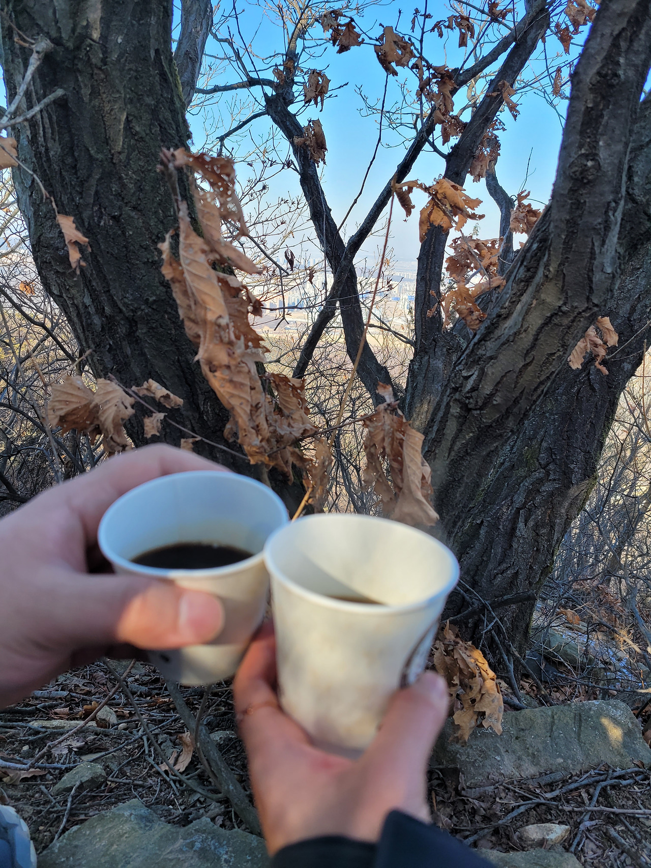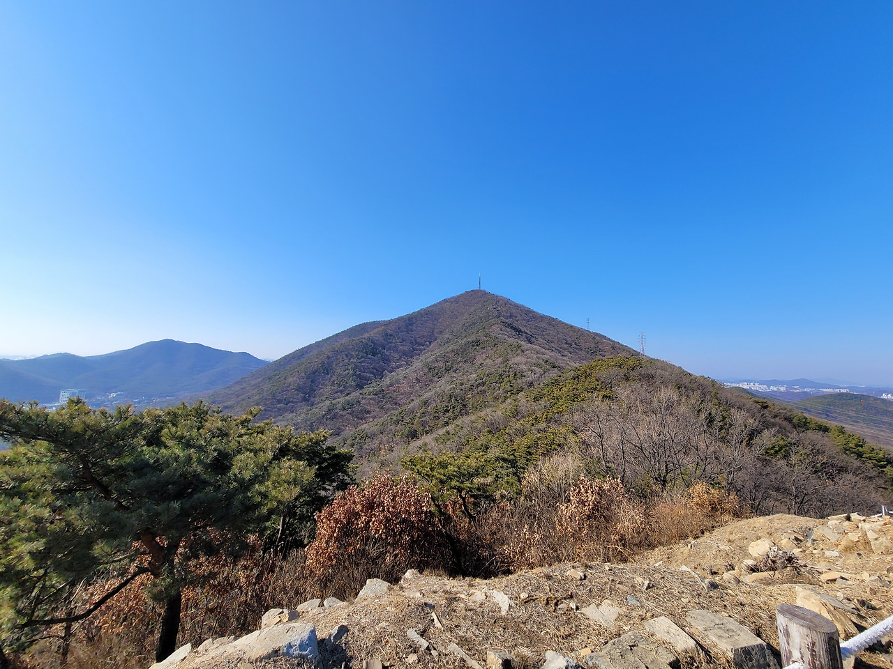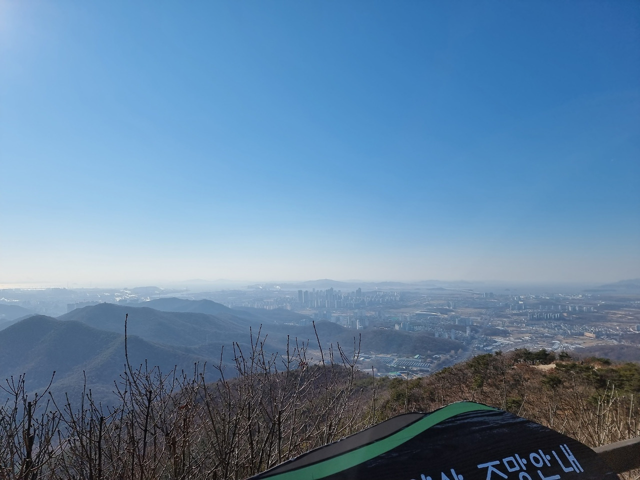 오른 지 얼마 안 돼 정상에 도달했다. 이럴 줄 알았으면 커피는 참을 걸 그랬나 약간은 아쉬웠지만 정상에서 느끼는 상쾌한 기분이 아쉬운 마음을 곧바로 덮어주었다. 오랜만에 타는 산이라 체력적으로 힘들어서 그런지 생각했던 것 이상으로 뿌듯함을 느꼈다. 춥다고 집에만 있을 뻔했는데 산을 타서 더 그렇게 느꼈을 것이다. 정상 기념사진을 찍고 한 곳에 자리를 잡고 앉았다.