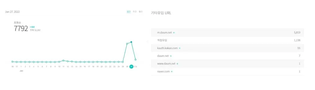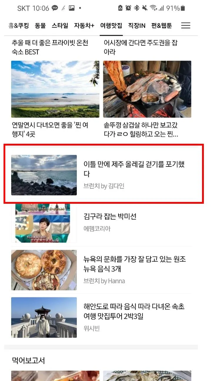 어제 놀라운 일이 생겼다. 며칠 전 다음카카오 브런치에 ‘이틀 만에 올레길 걷기를 포기하였습니다’라는 글을 썼는데 그 글이 다음 모바일 여행/맛집 카테고리 메인에 소개된 것이다. 그저께부터 조회 수가 1,000이 넘고 2,000이 넘고 3,000이 넘었다는 알림이 계속 떠서 ‘이게 무슨 일일까, 이러다 말겠지’ 했다. 어제는 아침에 9,000이 넘었다고 해서 이 정도면 어딘가에 내 글이 올라와 있을 것 같은 기대를 안고 글의 유입 경로를 확인했다. 대부분의 유입은 m.daum.net. 떨리는 마음으로 daum 앱을 켰다.