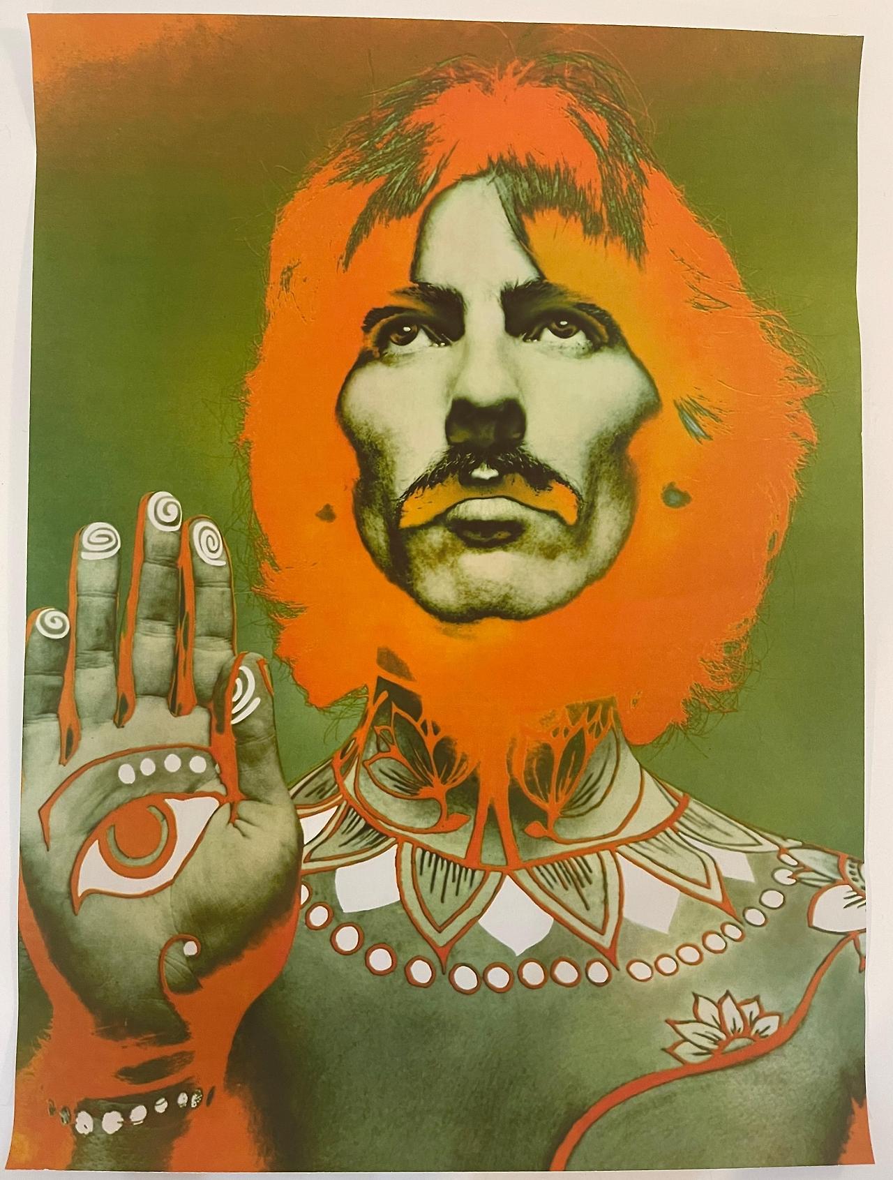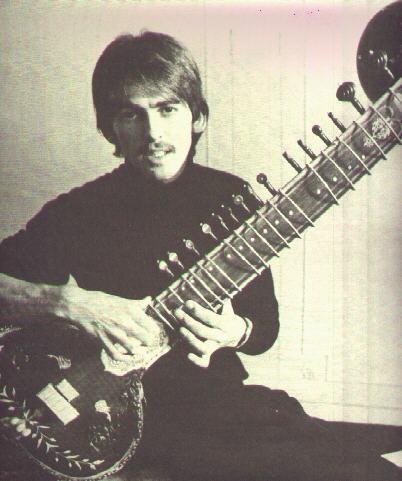 좌. 인도의 전통악기 시타르를 연주 중인 조지 해리슨 , 우. 사이키델릭한 힌두 이미지로 페인팅 된 조지 해리슨