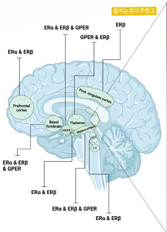 전전두엽(이성적 판단 영역), 해마(기억·감정 안정 담당), 편도체(불안·공포감 유발 영역), 시상하부(HPA축의 시작이자 조절의 핵심 영역)에 위치한다. 감정 조절 회로의 전체적인 안정성을 담당하는 영역에 수용체가 위치하기 때문에, 에스트로겐이 저하되면 감정에 영향을 줄 수밖에 없다.