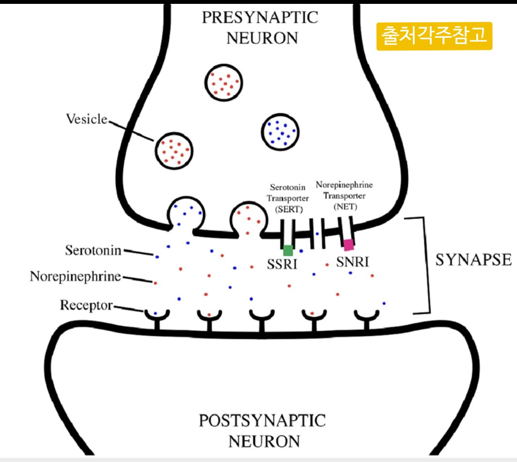 장에서든, 뇌에서든 작용하는 장기가 다를 뿐이지, 에스트로겐과 세로토닌의 연결성은 동일하다. 즉 에스트로겐이 줄면 세로토닌 분비가 준다. 세로토닌 수용체의 민감성도 떨어진다. 한편 아래 그림[2]과 같이 한번 분비가 일어나고, 시냅스 후 뉴런에 닿지 않은 세로토닌(파란색 점)은 시냅스 전 뉴런으로 재흡수가 일어난다.