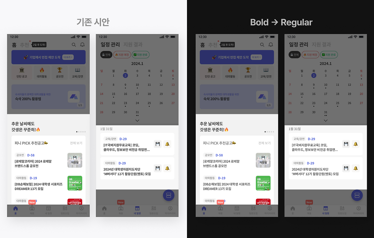 그렇기에 특정 영역에서 명확히 강조할 부분에만 Bold 패밀리를 사용해 주고 본문 폰트에 Regular 폰트를 사용해 준다면 디자인이 한결 가벼워 보이고 이러한 패밀리의 적절한 벨런스는 디자인의 균형을 유지하면서도 사용자에게 필요한 정보를 명확히 전달할 수 있는 시각적 안정감을 제공할 것이다.