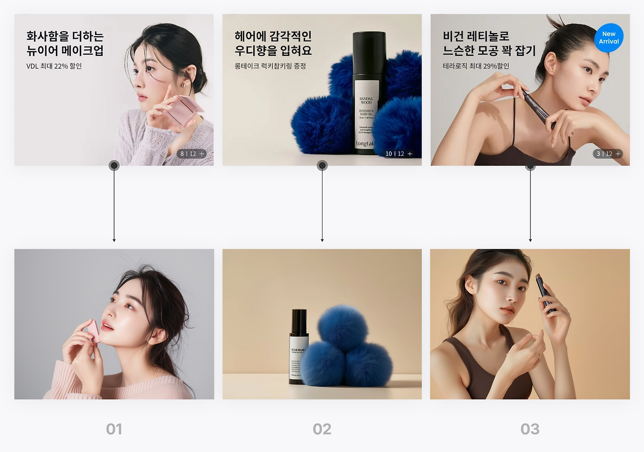 이런 Bad Case를 기피하고 올리브영에서 사용하고 있는 이미지의 3개를 골라 미드저니를 활용해 이미지를 제작해 봤다.