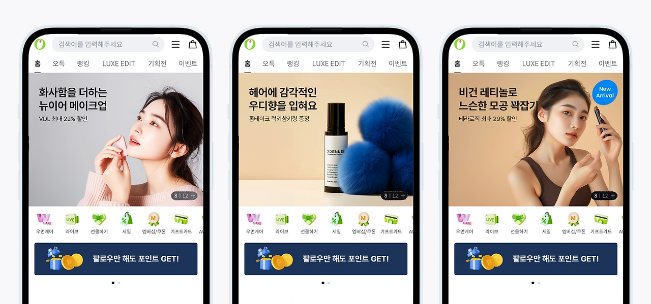 올리브영은 앞서 언급했듯 인물 이지미와 상품 스튜디오 컷을 활용해 운영 배너를 설계했다. 4:3 비율에 맞게 좌측은 텍스트를 배치하고 무게중심을 좌측으로 잡은 이미지를 배치해 시각적인 벨런스와 시선의 흐름을 안정적으로 체계화한 것을 볼 수 있다.