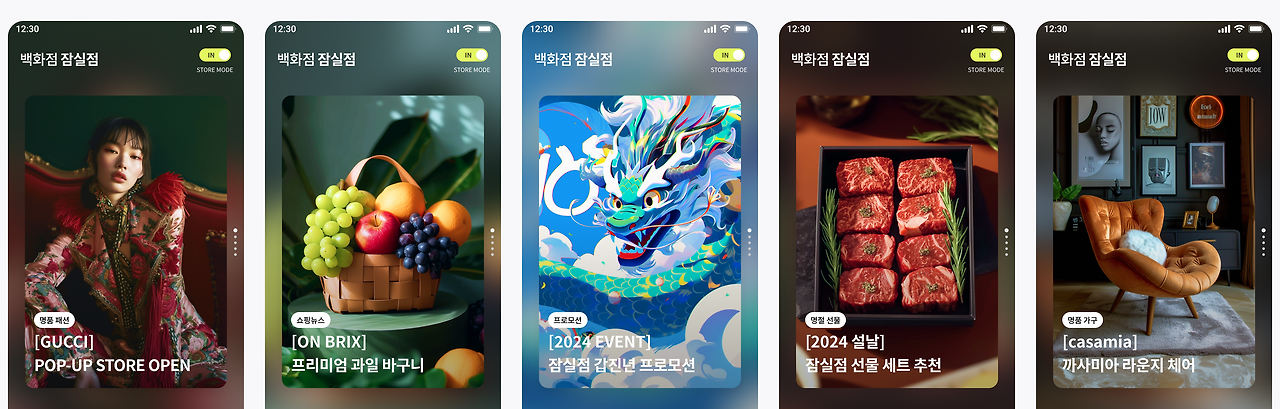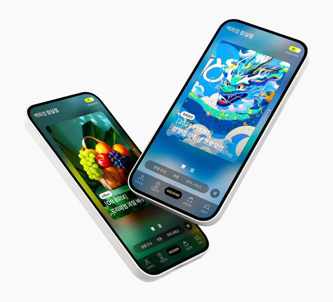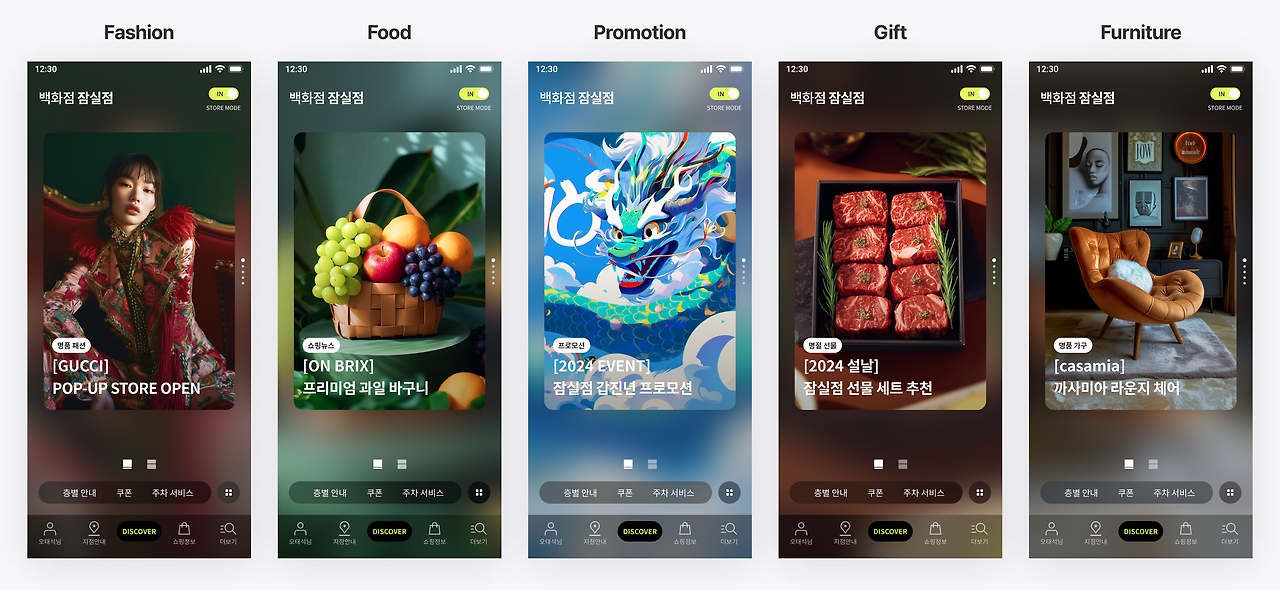 롯데백화점은 백화점 안에 있을 때 사용하는 'Store In' 기능과 백화점에 없을 때 사용하는 'Store Out'기능이 있다. 둘의 UI는 기본적인 BG와 카드 UI 컴포넌트 구성은 동일하나 사용자의 상황에 맞게 인터렉션 및 레이아웃이 달라지는데, 이번 장에선 롯데백화점 'Store In'에 들어가는 콘텐츠를 미드저니를 활용해 제작해 보고자 글을 작성하게 되었다.