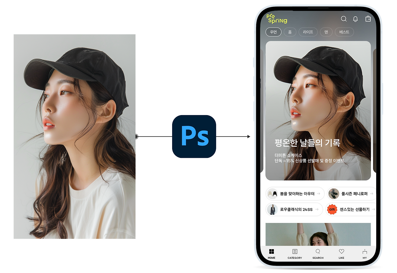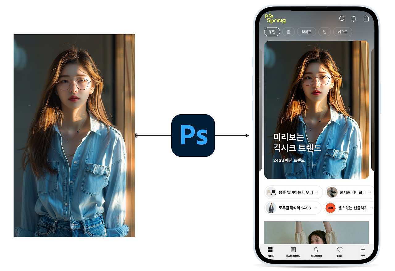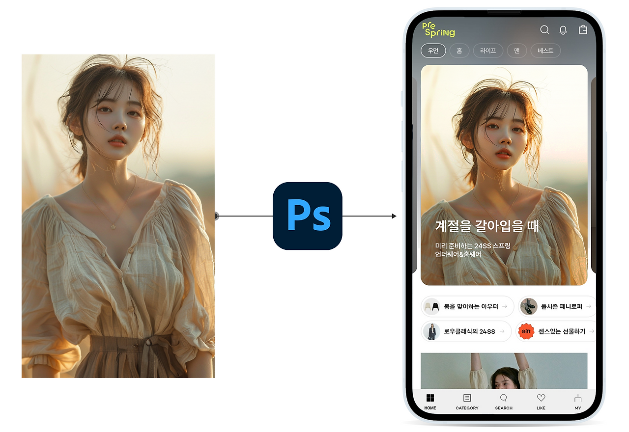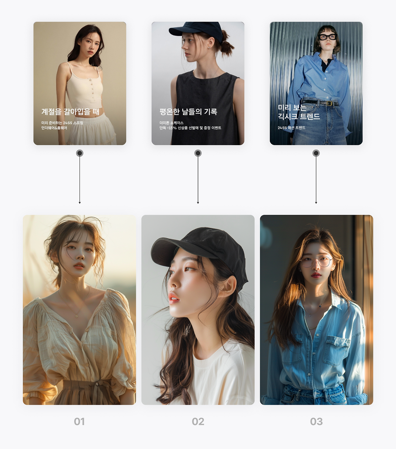 이렇게 카드 컴포넌트에 적용된 요소들을 지키면서 29CM의 이미지를 미드저니를 활용해 유사한 이미지를 도출해 봤다.