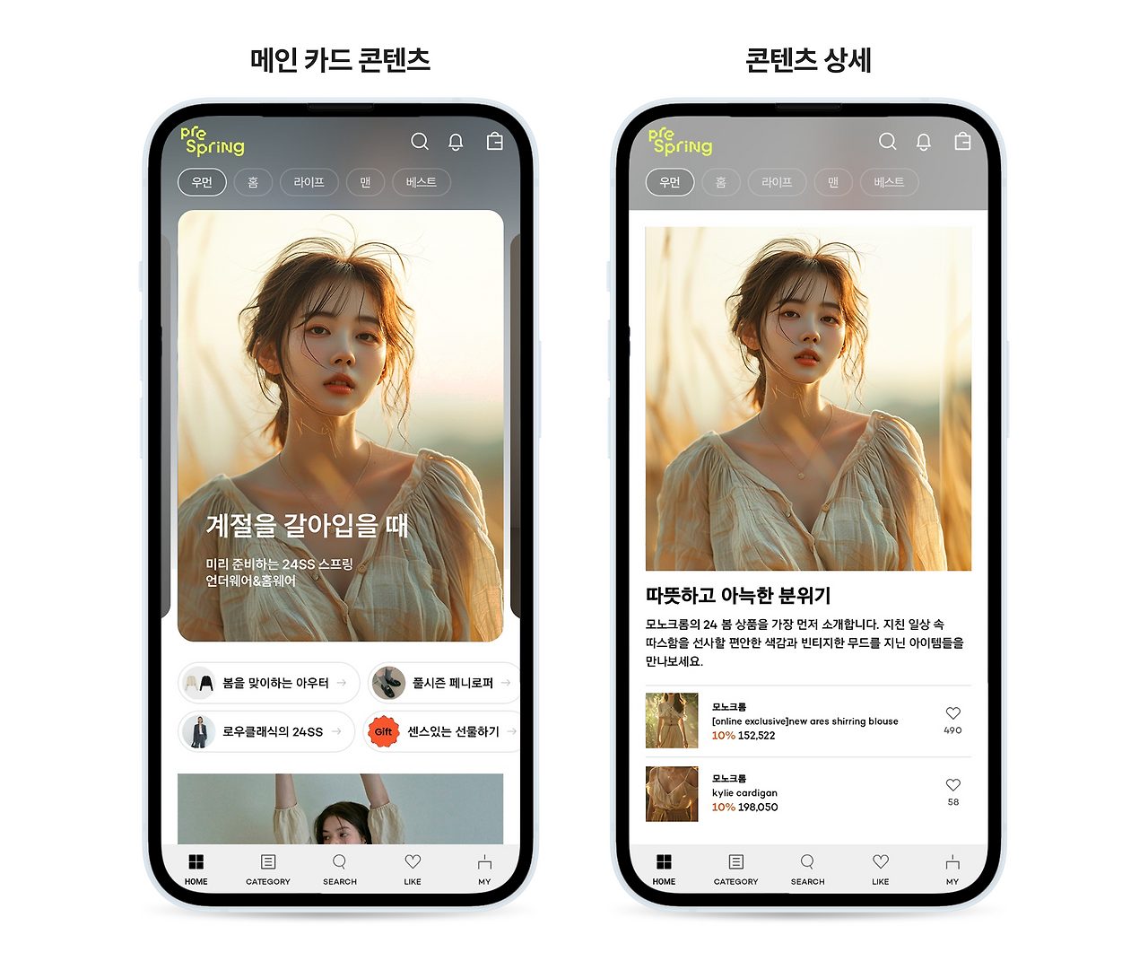 29CM는 이미지 무게 중심이 일관되게 형성되어 있는 사진들로 카드 컴포넌트를 구성했다. 서비스 진입 시
