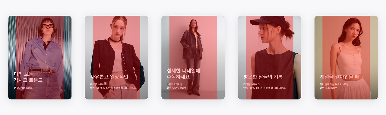 29CM의 메인 카드 컴포넌트는 프로모션과 사용자들을 추가적인 콘텐츠 뎁스로 연결시키는 중추적인 역할을 하고 있다. 카드 컴포넌트의 이미지에 따라 블러 처리된 이미지가 백그라운드에 깔리며, 유려한 인터렉션을 통해 콘텐츠 탐색에 부드러움을 더하고 있다.