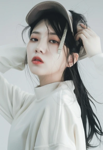 Korean woman, photograph, model, warm tone, wearing ball cap, natural, Looking to the side, stylish hair, solid white environment, studio lights, nikon d850, extreme long shot --ar 3:5 --v 6.0