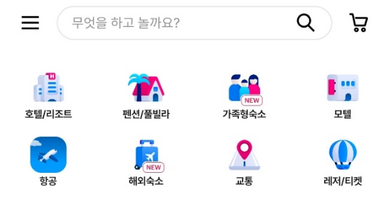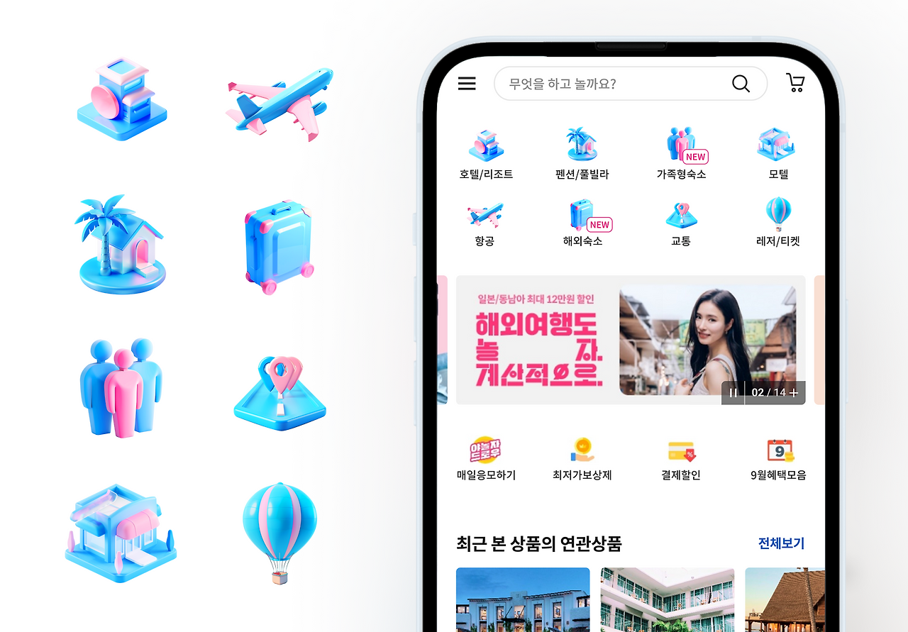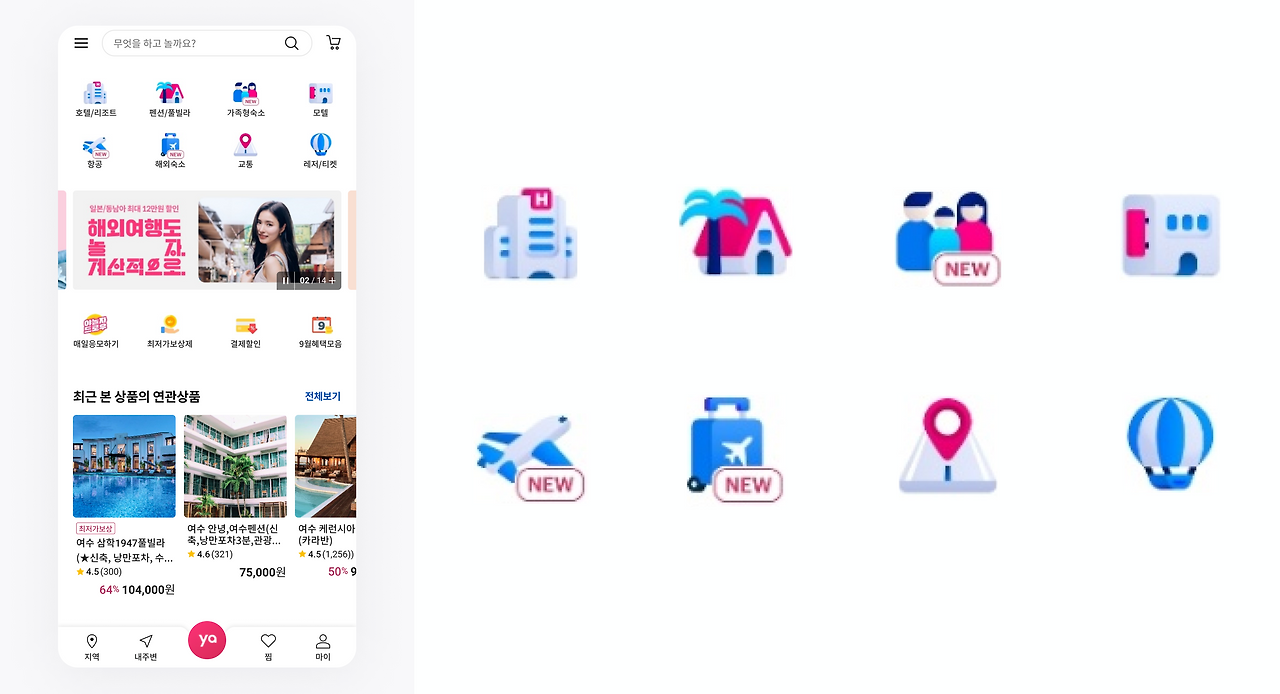 야놀자 서비스에 진입하면 시선에 먼저 보이는 요소가 있었다. 바로 서비스 스크린 상단에 위치한 탭 버튼에 사용된 아이소메트릭 그래픽 에셋이다.