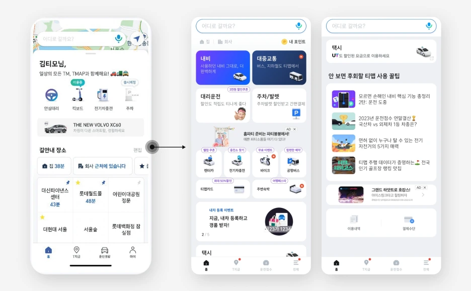 이번 장에서는 '올 뉴 TMAP'의 메인 홈 디자인과 지금의 TMAP을 있을 수 있게 했던 기능인 내비게이션 기능을 네이버 지도와 카카오 네비의 기능과 비교해 보며, 사용자 경험과 편의성을 중심으로 살펴보면 어떤 차이가 있는지 살펴볼 예정이다.