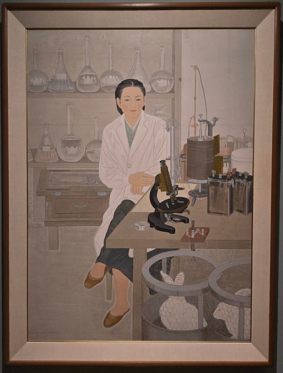 <탐구>에서는 옥색 한복 위에 흰 가운을 걸친 여인이 여러 실험도구들이 가득 찬 연구실에서 당당히 정면을 응시하고 앉아 있다. 여성이 앉아 있는 연구실은 당시 경성제국대학 의학부 실험실에서 직접 사생한 것이어서 현실적인 공간감을 보여준다.
