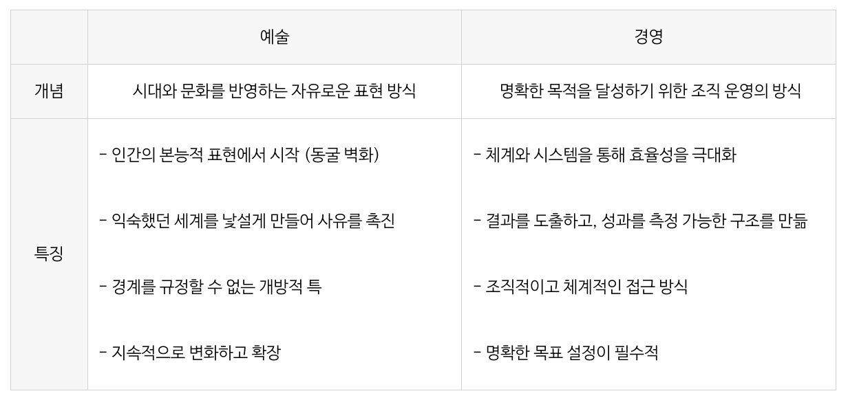 표로 정리해두고 보니, 예술과 경영이 단순히 결합될 수 없었던 이유가 분명해졌다. 두 개념은 본질적으로 너무나 다른 방향성을 가지고 있었다. 예술이 자유롭고 비결정적인 성격을 지녔다면, 경영은 질서와 체계를 통해 구체적인 결과를 창출하는 데 초점을 맞춘다. 예술은 본능적이고 감각적인 흐름을 따르지만, 경영은 체계적이고 목표 지향적인 방식을 요구한다. 예술이 자유로운 창작의 영역이라면, 경영은 명확한 목적과 성과를 중시한다. 결국, 단순히 두 개념을 ‘합친다’는 방식으로 예술경영을 바라봐서는 안 된다는 결론에 이르렀다.