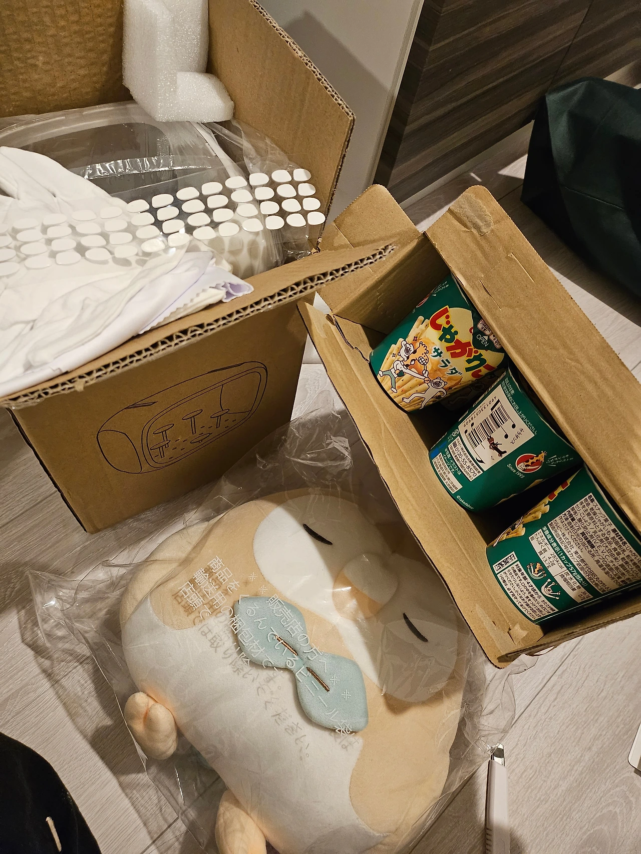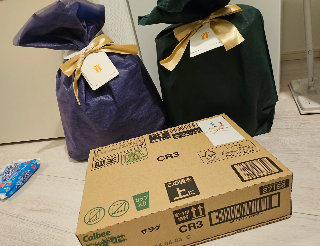 커다란 두 선물 꾸러미와 쟈가리코 샐러드 맛 12개입 상자가 모습을 드러냈다(...).