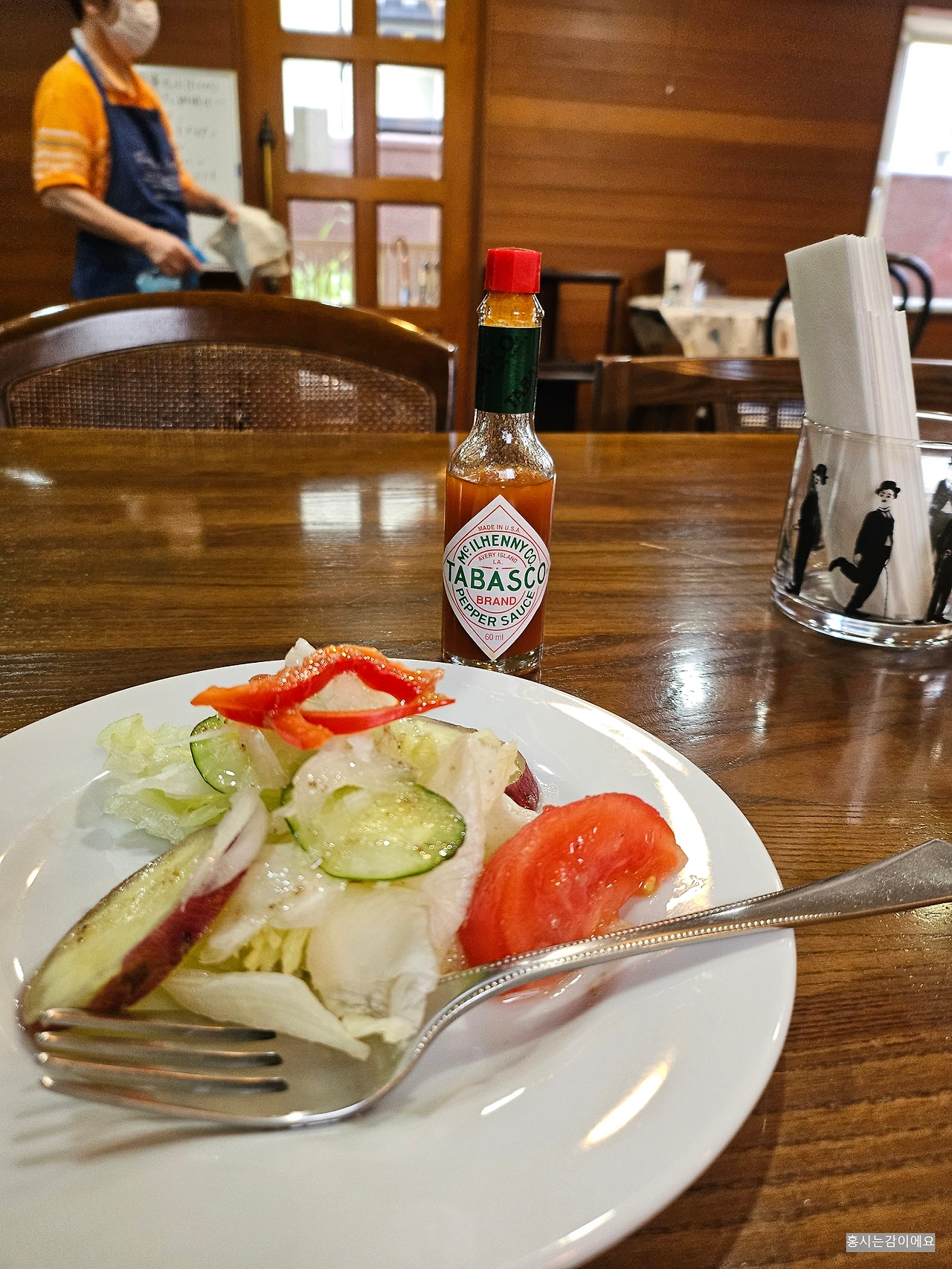샐러드가 먼저 나왔다. 소스병도 옆에 가져다주셨다. 고구마 슬라이스와 토마토, 양상추, 오이 등을 드레싱으로 버무린 간단한 샐러드였는데 어찌 그리도 맛있던지. 아삭아삭한 식감, 고소한 풍미가 더운 계절에 지친 입맛을 최고조로 높여주었다. 어떤 드레싱을 쓰는지 당장이라도 여쭙고 싶었다.