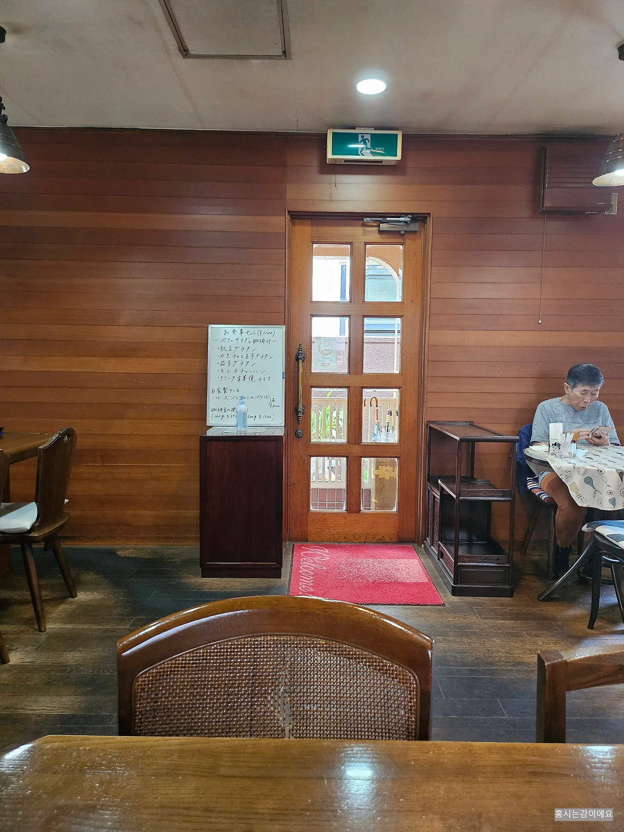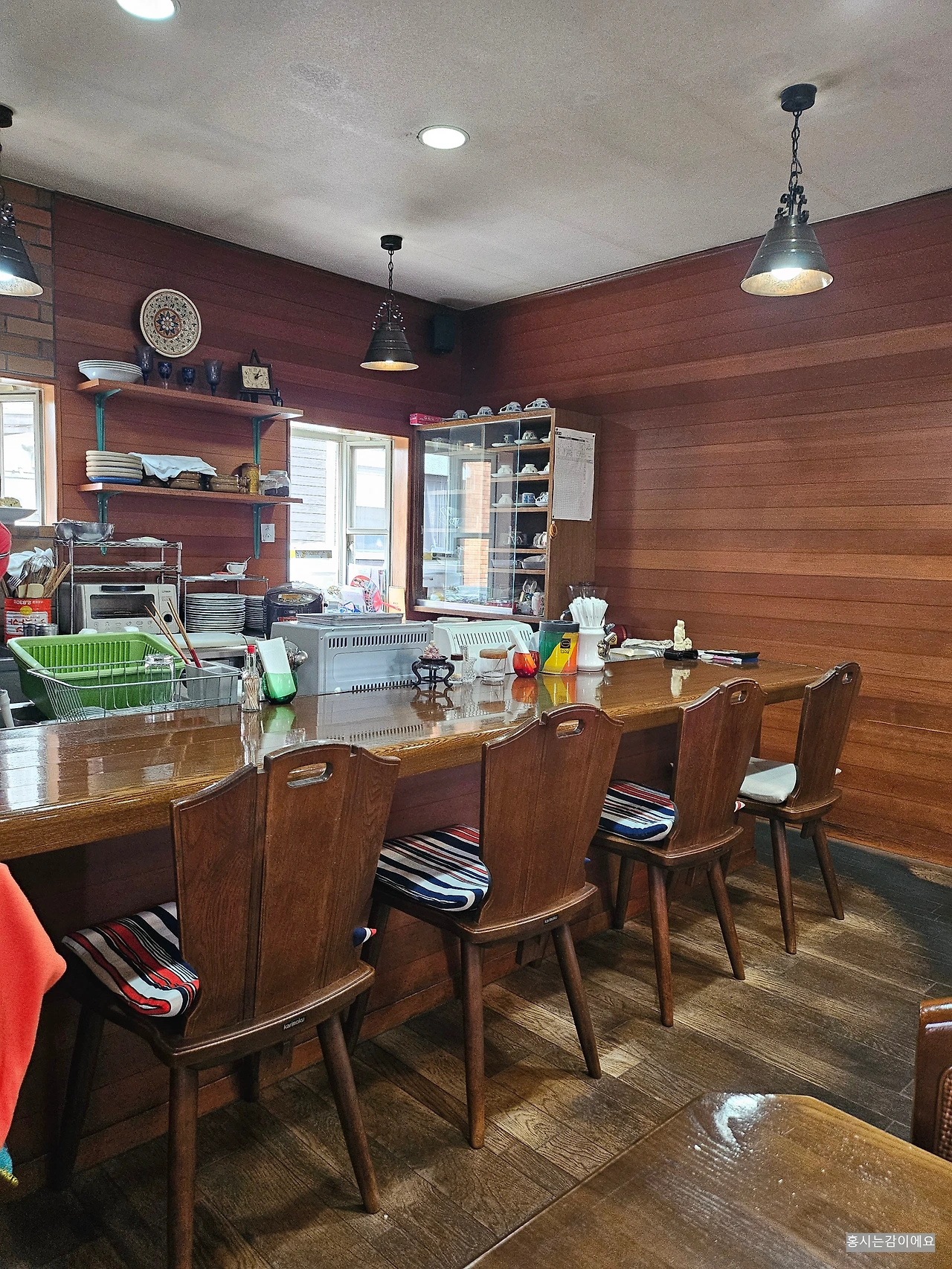 온통 목조로 가득한 공간에서 나는 어디에 앉으면 좋을지 잠시 서서 망설였다. 비어있는 테이블은 카운터석과 4인석, 6인석이었는데, 카운터석은 부담스러웠고 혼자 왔는데 4인석에 앉아도 되려나? 싶었지만 손님이 더 오지는 않겠거니 싶어 홀로 4인석을 차지하는 사치를 누렸다.