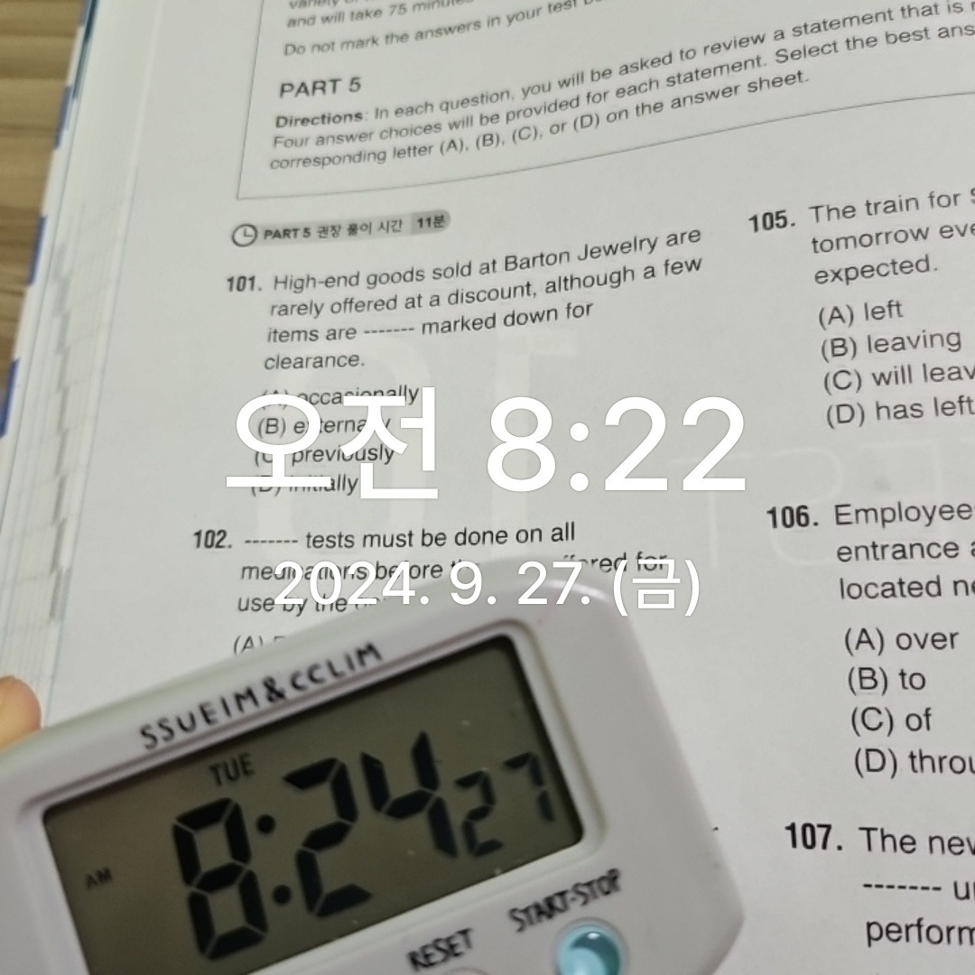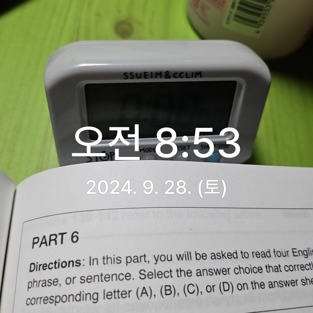 설상가상 끝나기 5분 전에 파트 5에서 4문제나 급히 고쳤고, '뒤에는 얼마나 틀린 게 많을까'라고 좌절하며 시험장을 나섰다.