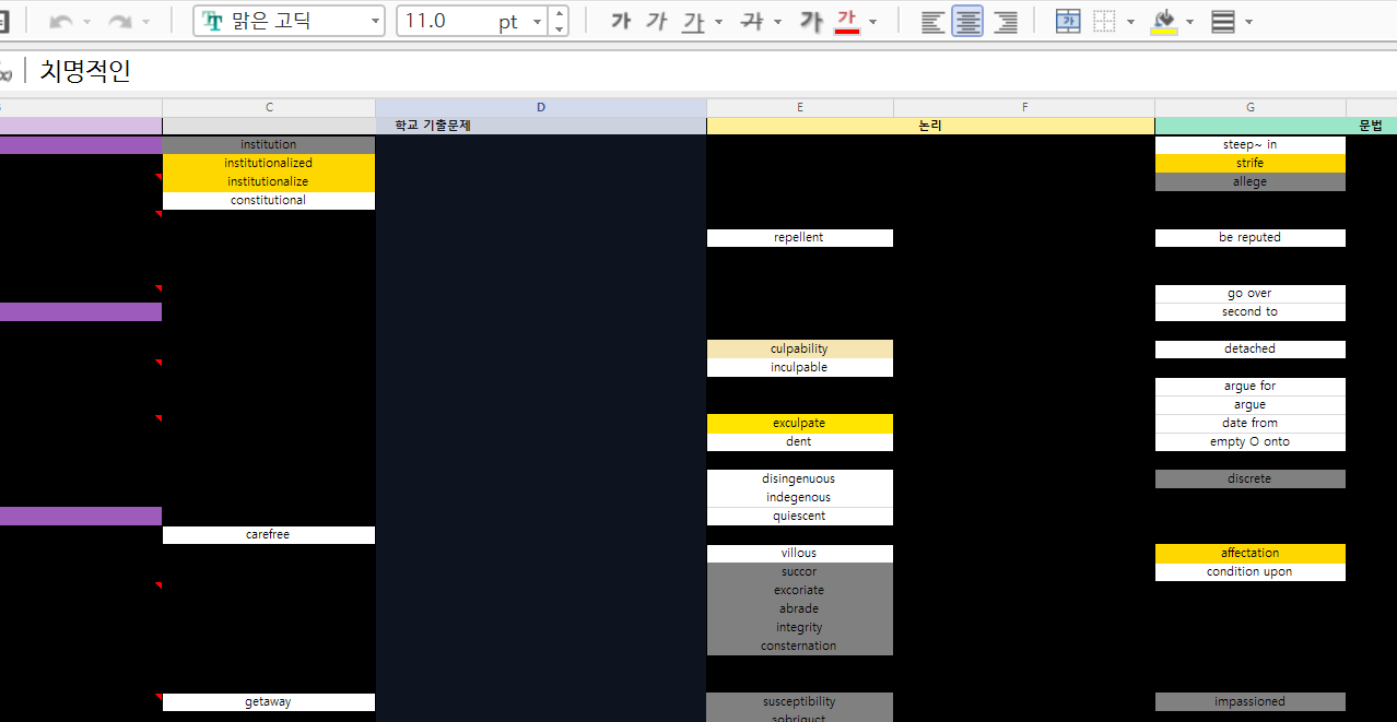 뜻은 처음부터 전부 까맣게 칠해두고. 영단어 셀에서 아래 방향키를 톡톡 눌러가며 외우면 정말 금세 외워진다. 기억나지 않으면 까맣게 칠해진 단어 뜻의 셀로 움직여 상단에 뜨는 내용을 보면 된다.