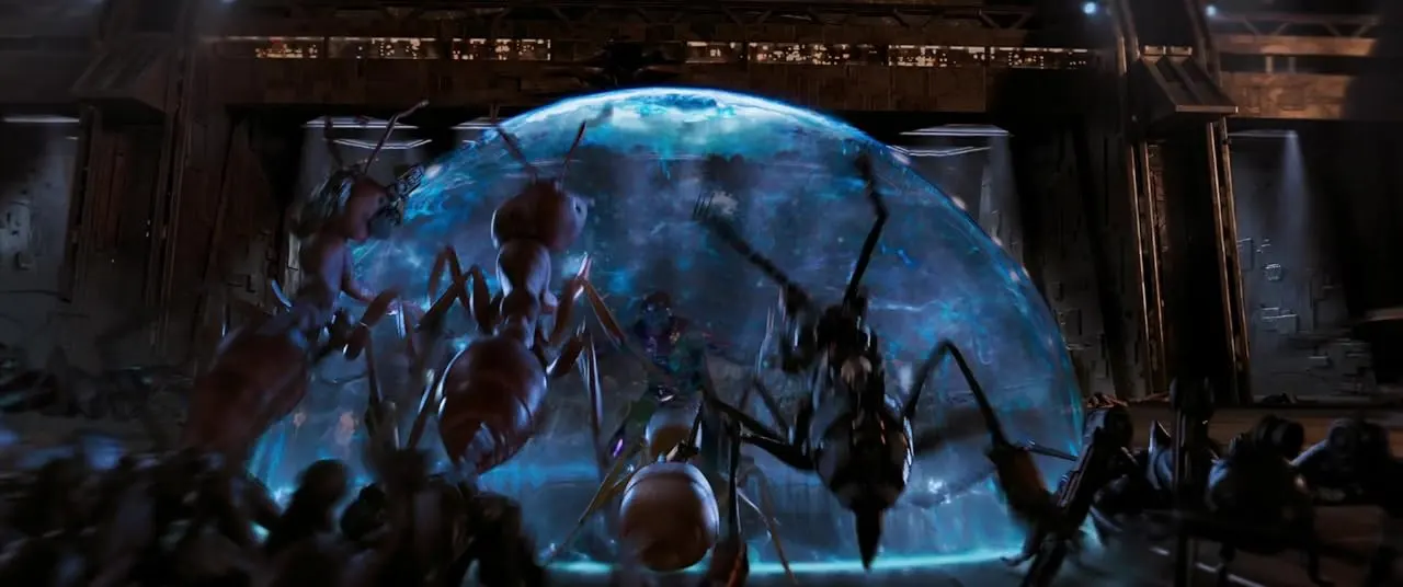 심지어 제목이 앤트맨 임에도 불구하고 이 영화는 개미를 홀대한다. 이 시리즈가 개미의 능력을 내내 찬양해왔음에도 불구하고, 인간과 개미의 관계는 주종 관계 이상으로 나아가지 못한다. 행크 핌(마이클 더글라스) 박사의 돌격 구호와 함께 개미들은 죽음을 향해 맹목적으로 달린다. 그리고 개미가 질주하도록 조종하는 건 핌 박사가 개발한 기계가 방출하는 전기 신호다. 이 영화는 종 간의 교감에 시간을 투자하지 않는다. 앤트맨 1편과 2편, 심지어 3편까지 언제나 위기에서 그들을 구해줬던 우리의 친구 개미들은 양자 세계에 남겨지고, 결국 스캇과 일행들은 그들에게 한정된 가족주의를 되새기며 일상으로 돌아간다. 개미들이 다른 세계에서 과학력을 쌓아 그들을 구하러 돌아왔다는 점에서 이 영화는 일종의 배반 서사다. 이 영화와 캐릭터들이 관계 맺는 방식은 비민주적이고 차별적이다.