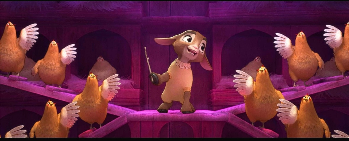 아샤 일행이 우연히 연 방문 뒤로 수 십 마리 닭들의 군무가 펼쳐진다. 지휘봉을 쥔 발렌티노의 자신만만한 목소리와 닭들의 울음소리가 무대를 채운다. 그 뒤 방벽에는 다닥다닥 붙은 닭장들이 위아래로 들어차 있다(이 노래의 제목이 "The Happy Chicken Song"인 점은 정말 아이러니다). 그때를 시작으로 영화는 닭의 등장마다 알을 낳는 쇼트를 이어서 삽입한다. 결말 즈음 마법 지팡이를 하사 받은 아샤는 실수로 닭을 거대화하는데, 이 영화가 동물을 대하는 태도를 볼 때 다음 장면에서 기대할 수 있는 건 우스꽝스러운 표정으로 자기만큼 거대한 알을 낳는 가축의 기능성 홍보 정도다. 실제로도 그랬다.