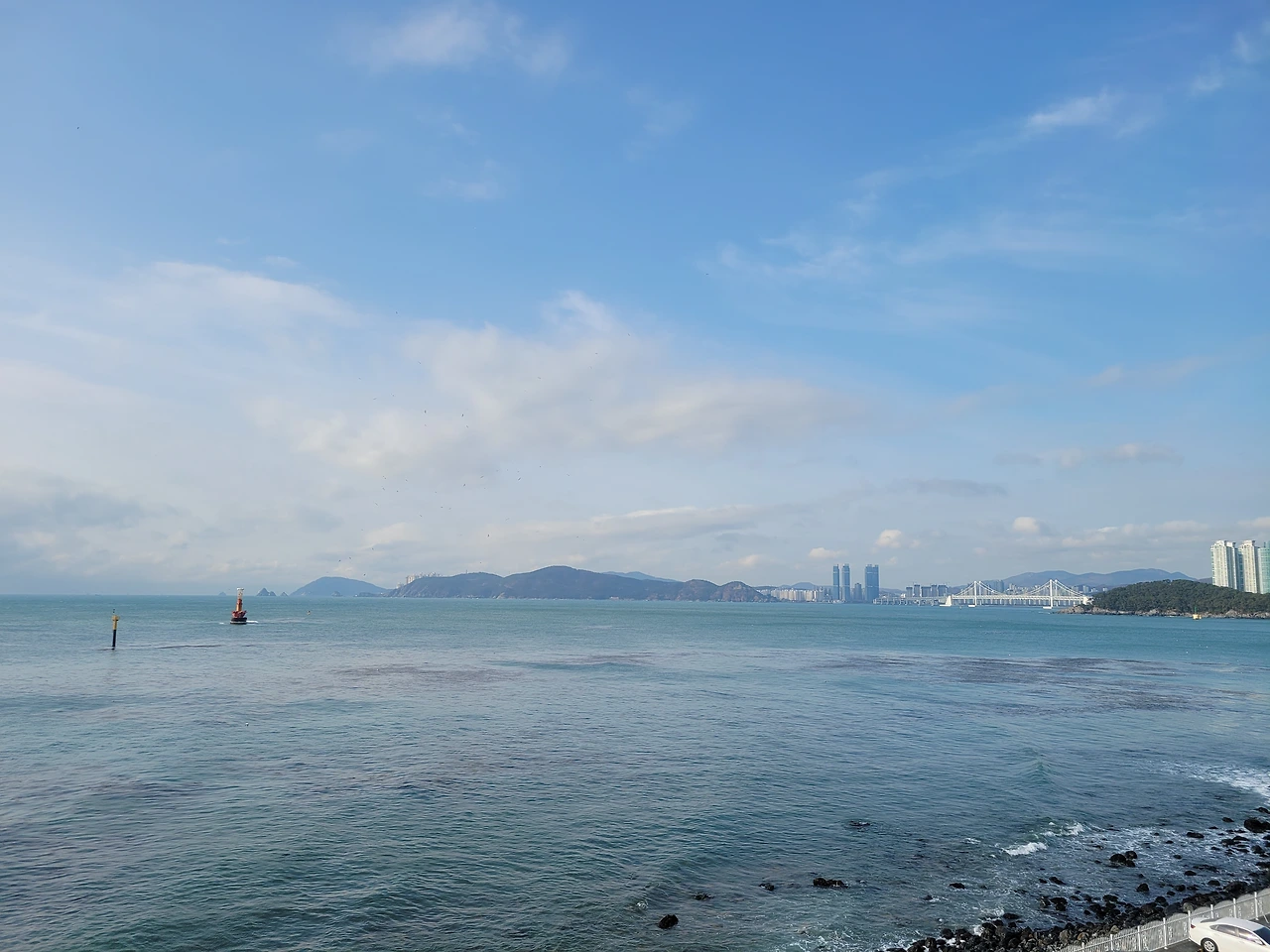 비가 어느새 바닥을 적셔 곳곳에 물웅덩이를 만들어 눈이 부셨다. 선연한 바다를 보고 싶지만 부담이 돼서 선글라스를 끼고 저 멀리 수평선을 바라보며 걸었다. 뒤돌아보니 엘시티 건물과 해변, 멀리는 광안대교까지 보인다. 한편 그림 같은 장면을 보니 내가 걸어온 길인데도 새로운 세상같이 느껴진다.