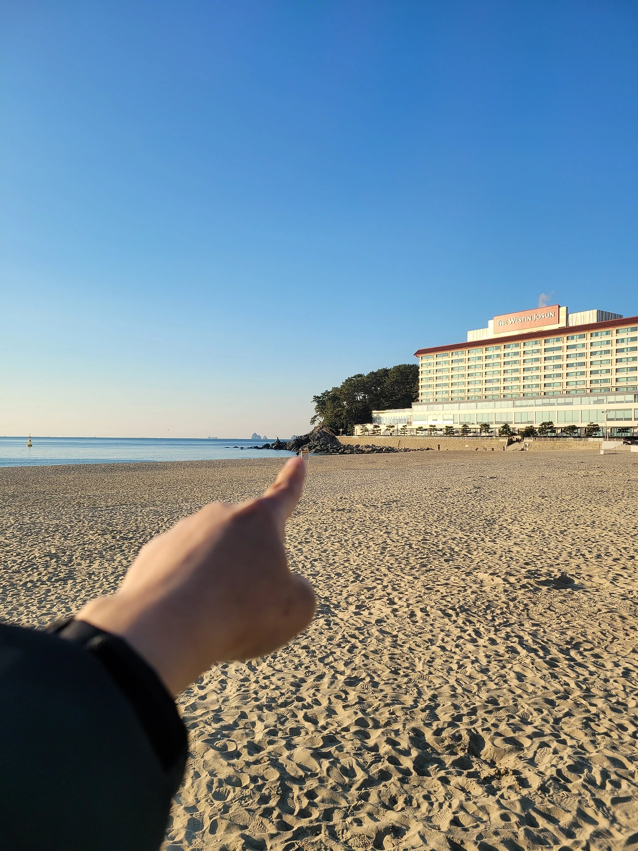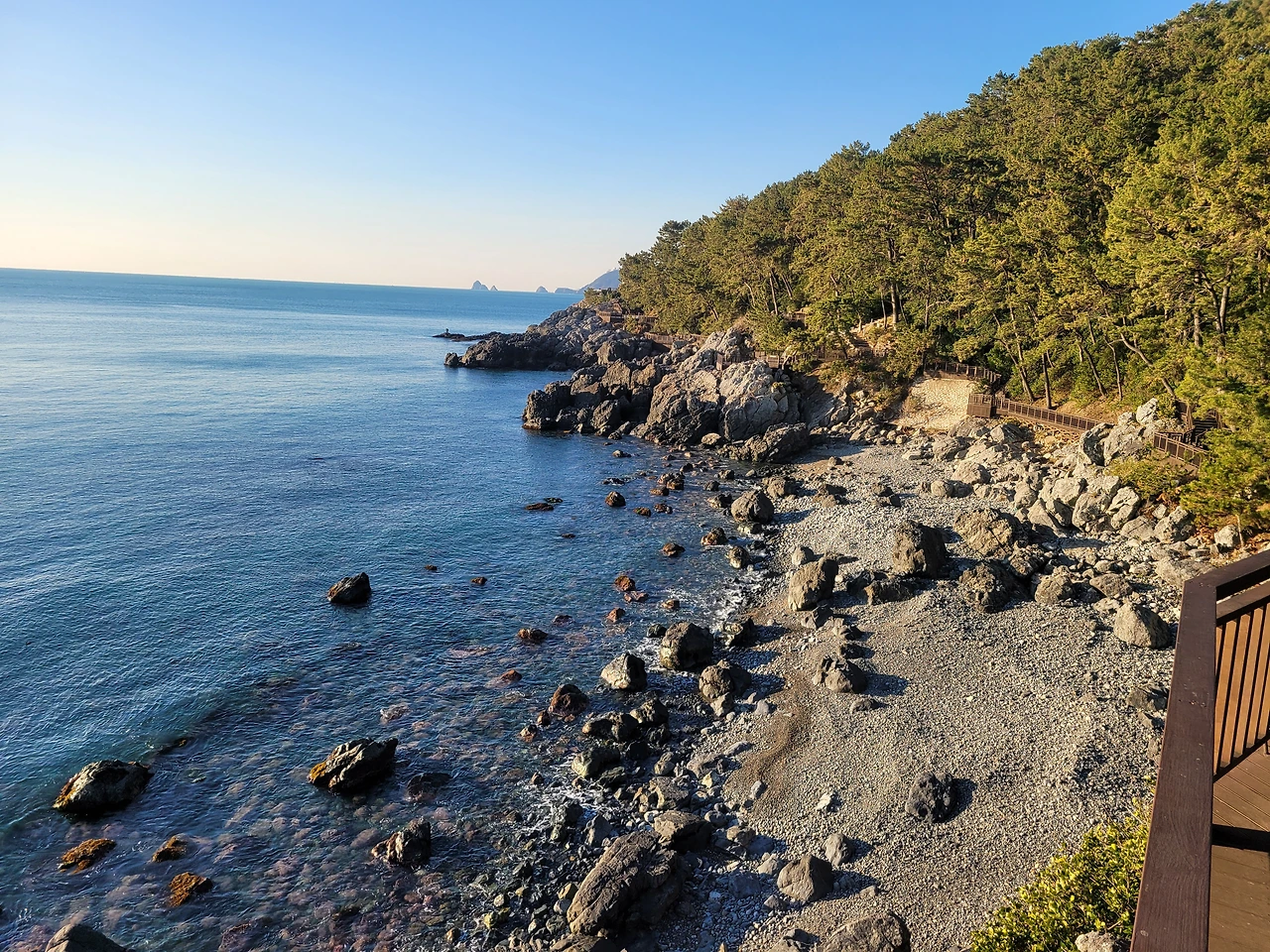 호텔 앞에는 좁은 길이 있는데, 이곳으로 들어서면 높은 파도가 덮치듯 맞이하는 계단이 나오며 동백섬으로 이어진다. 해수욕장은 때때로 많은 사람들로 붐비는 날도 있지만 이곳은 비교적 한산해서 나만 아는 골목길에 들어가는 느낌이라 정겨운 느낌마저 든다.